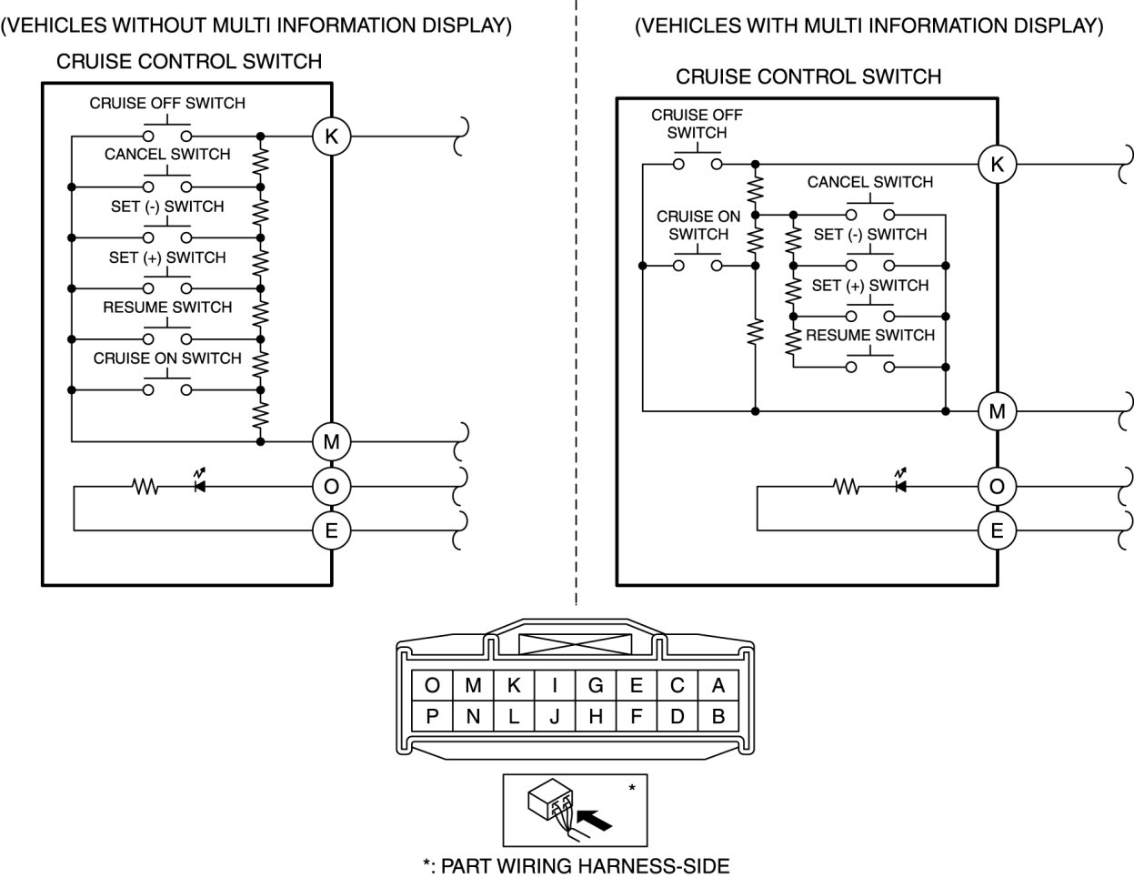 5. Inspect for resistance and continuity between cruise control switch terminals K and M (part wiring harness-side) using a tester.