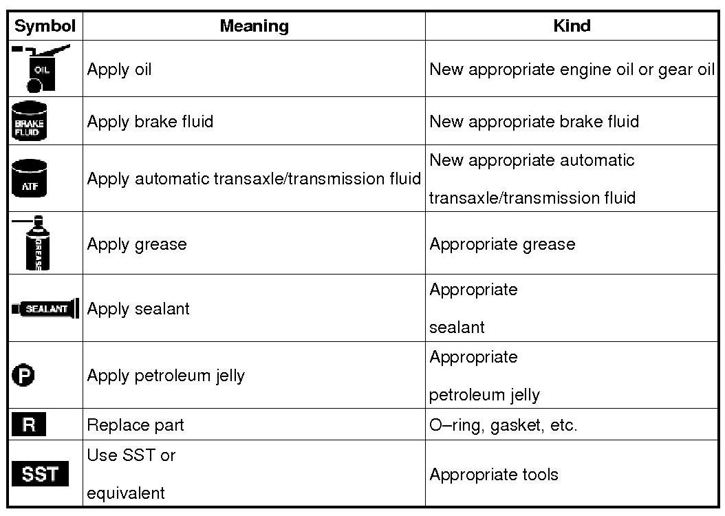 - There are eight symbols indicating oil, grease, fluids, sealant, and the use of SST or equivalent. These symbols show application points or use of these materials during service.