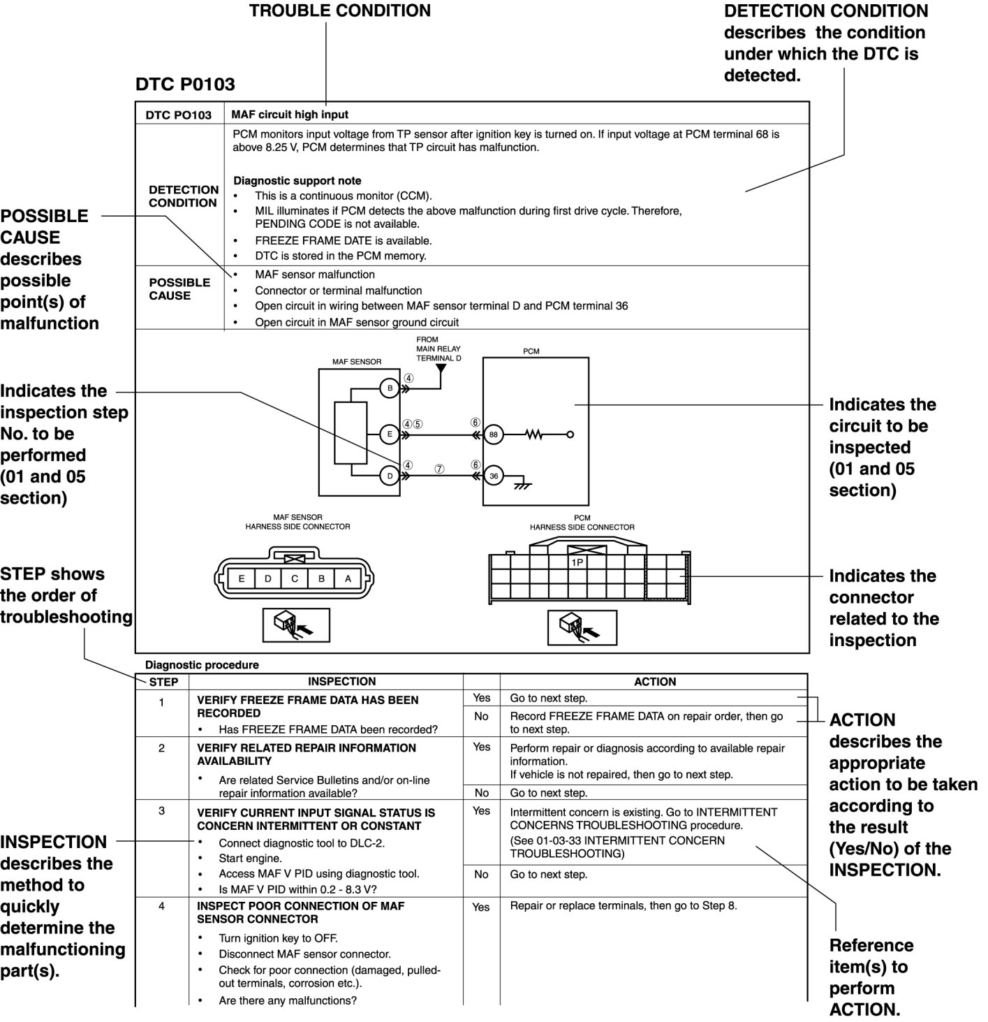 - DTC troubleshooting flow shows diagnostic procedures, inspection methods, and proper action to take for each DTC.