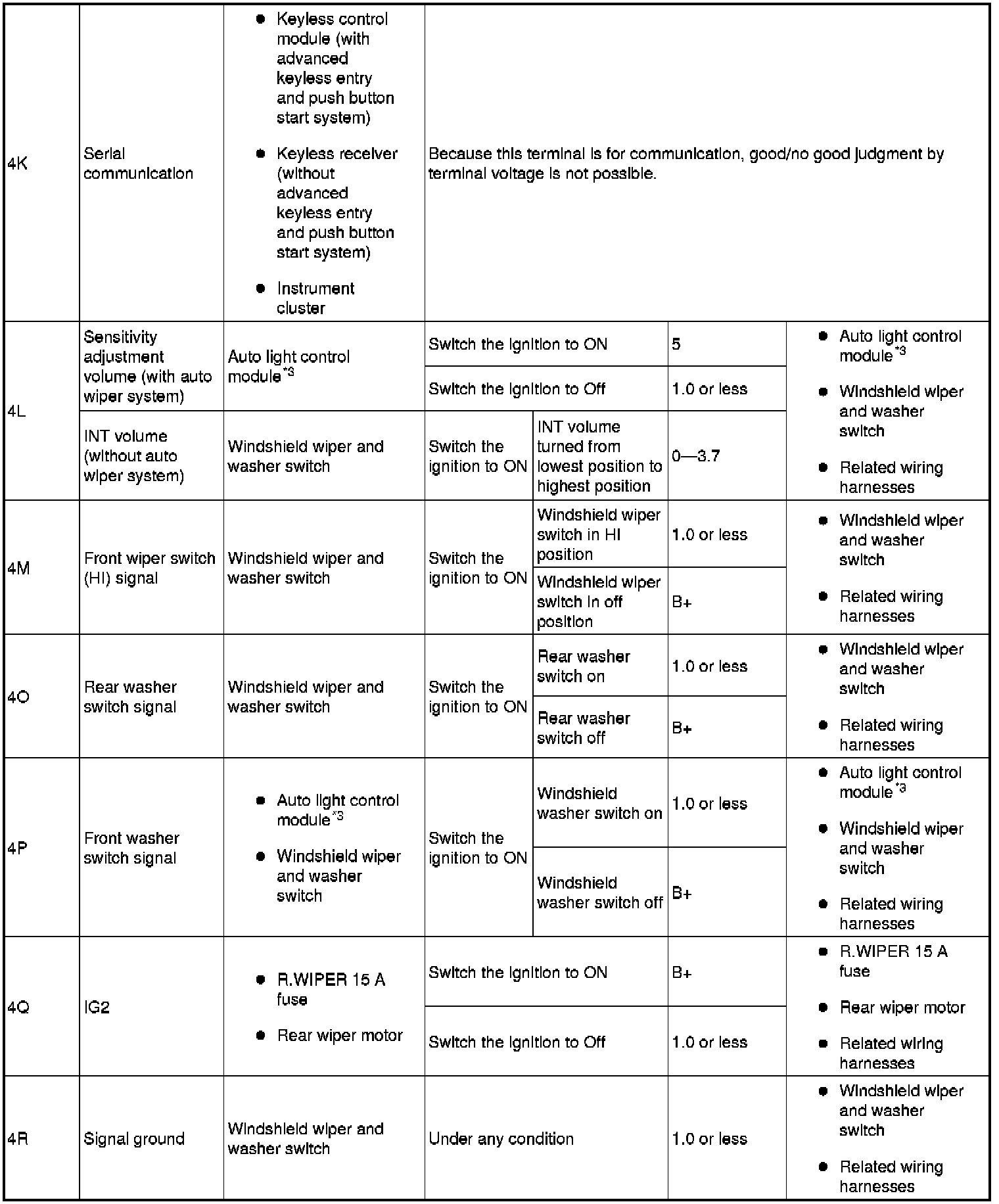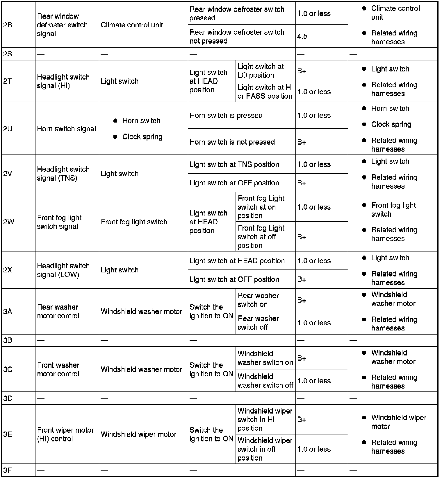 - If the voltage or continuity is not as specified in the Terminal Voltage Table, inspect the parts under "Inspection item (s)".