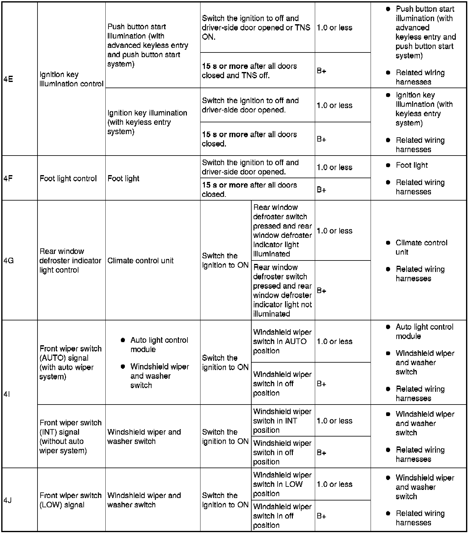 - Lock/unlock input (passenger-side door lock-link switch) (rear door lock link switch (RH, LH)): 6J (+) and body ground (-)