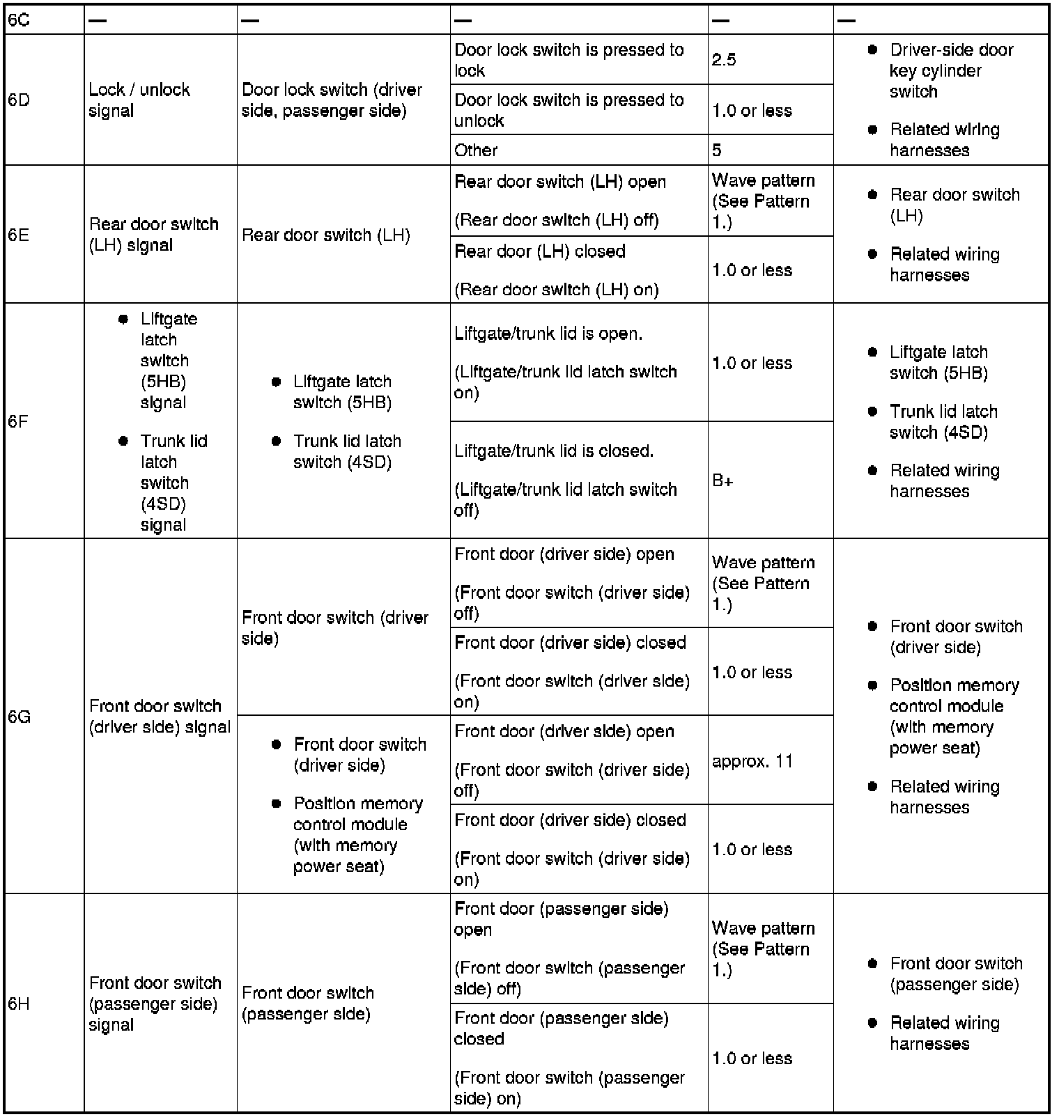- Rear door switch (LH) signal: 6E (+) and body ground (-)