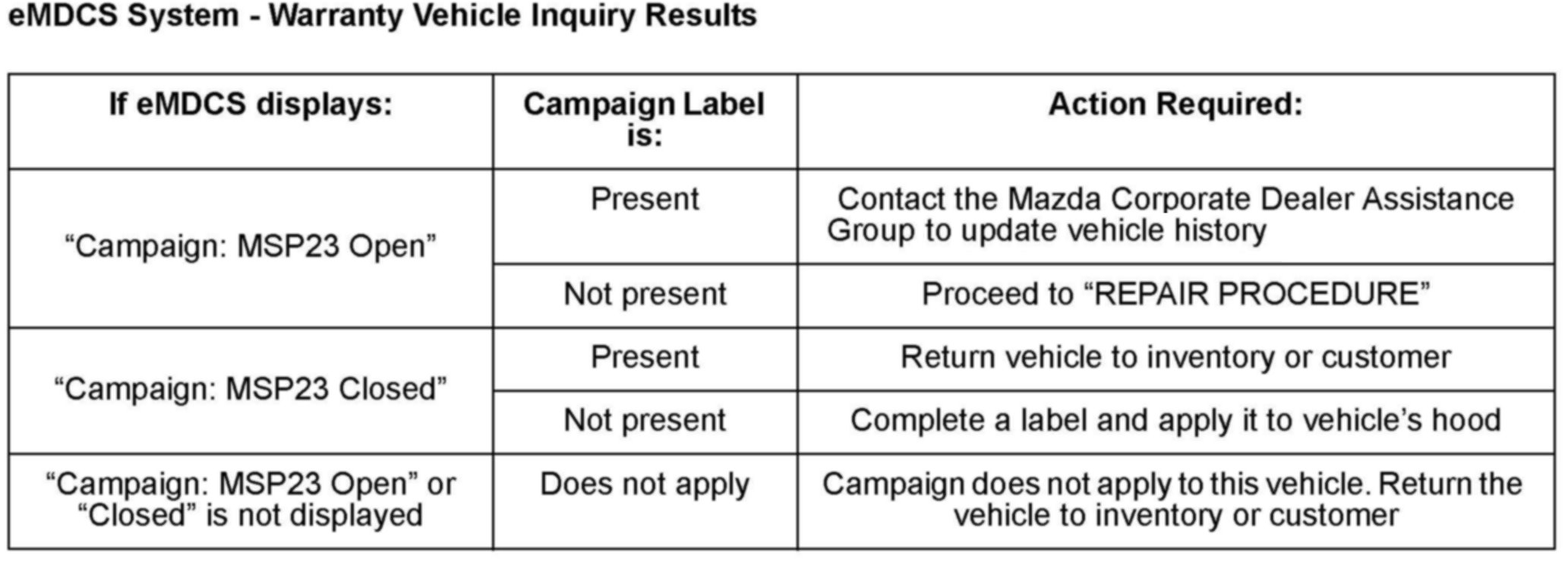 ^ BEFORE PERFORMING ANY REPAIR, VALIDATE THAT THE VEHICLE IS APPLICABLE TO THIS PROGRAM BY PERFORMING AN "eMDCS WARRANTY VEHICLE INQUIRY" AND VERIFYING THE VEHICLE DISPLAYS CAMPAIGN M5P23" AND ITS CAMPAIGN STATUS DISPLAYS OPEN". SEE VEHICLE INSPECTION PROCEDURE" BELOW.