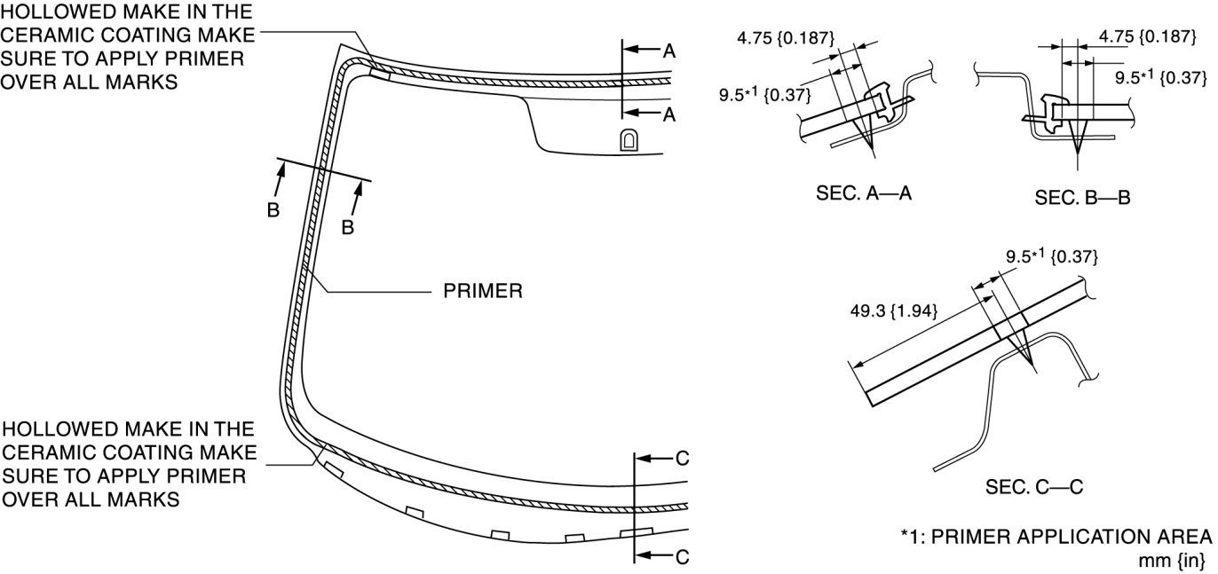 2. Clean and degrease an approx. 50 mm {2.0 in} wide strip along the perimeter of the windshield.