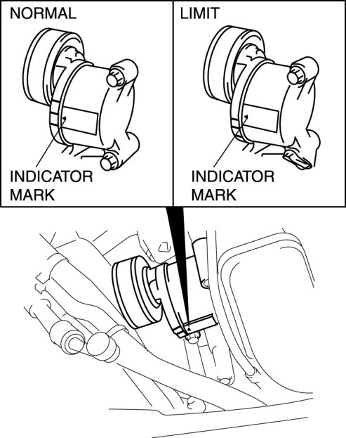 1. Verify that the drive belt auto tensioner indicator mark does not exceed the limit.