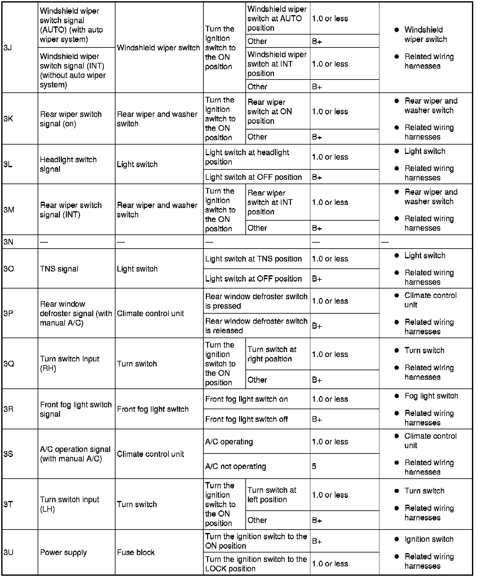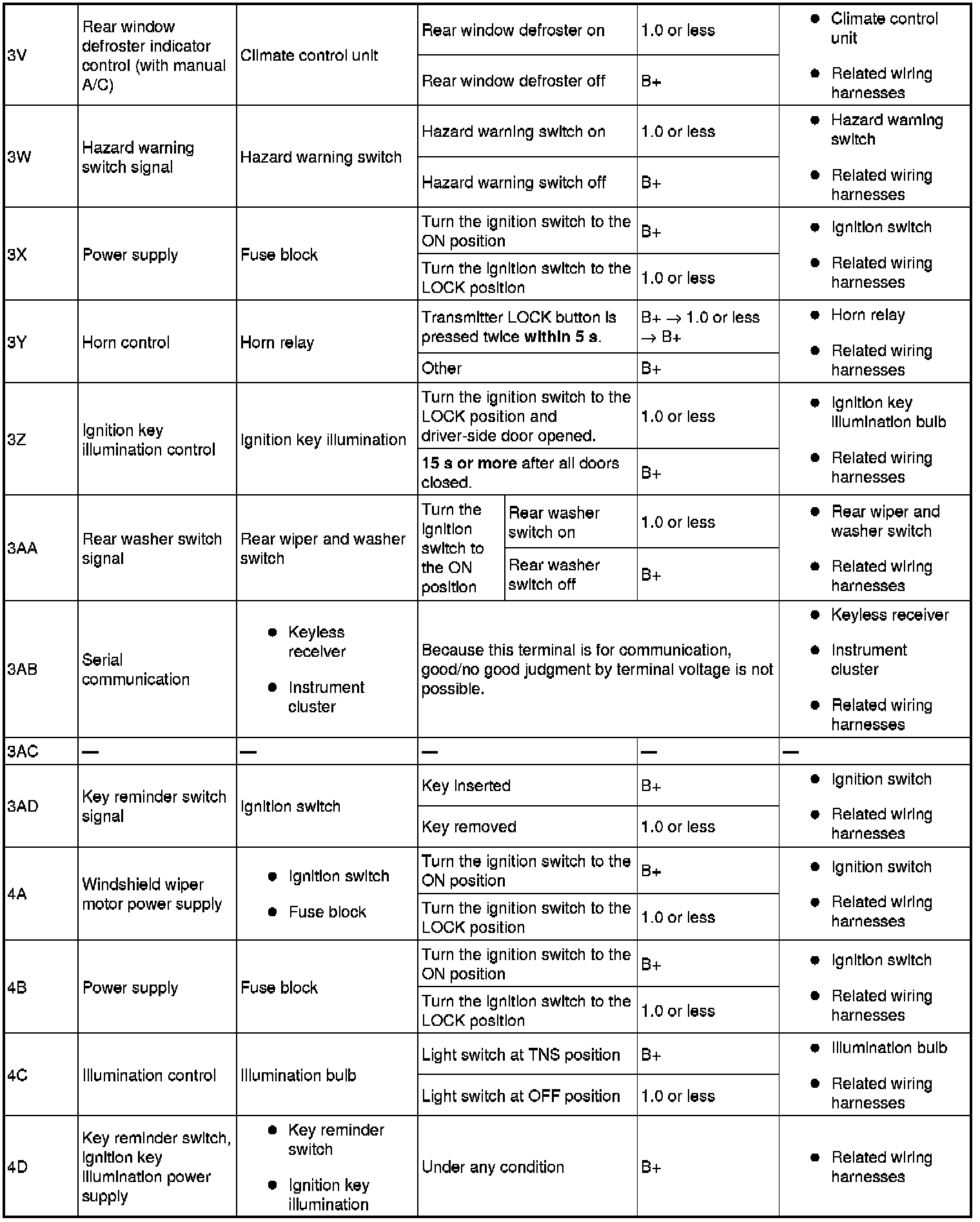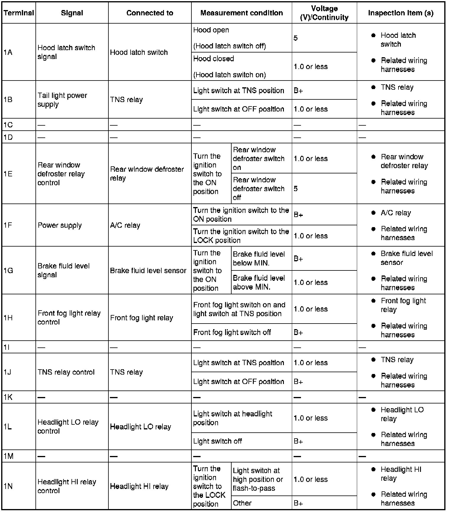 - If the voltage or continuity is not as specified in the Terminal Voltage Table (Reference), inspect the parts under "Inspection item (s)".