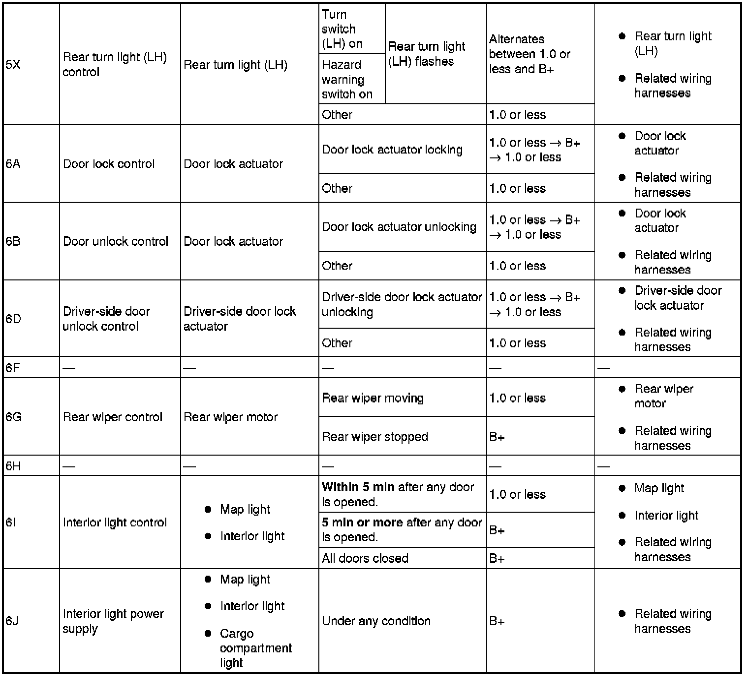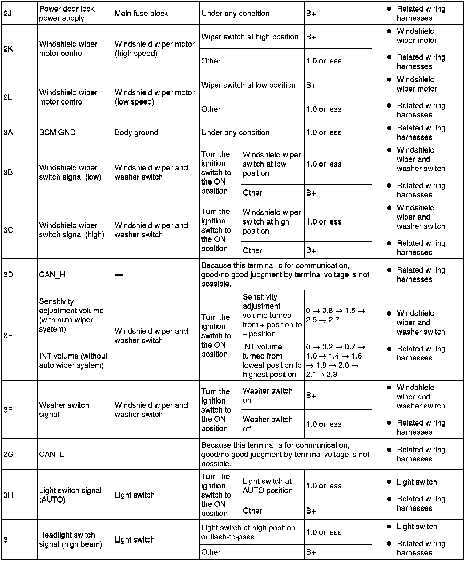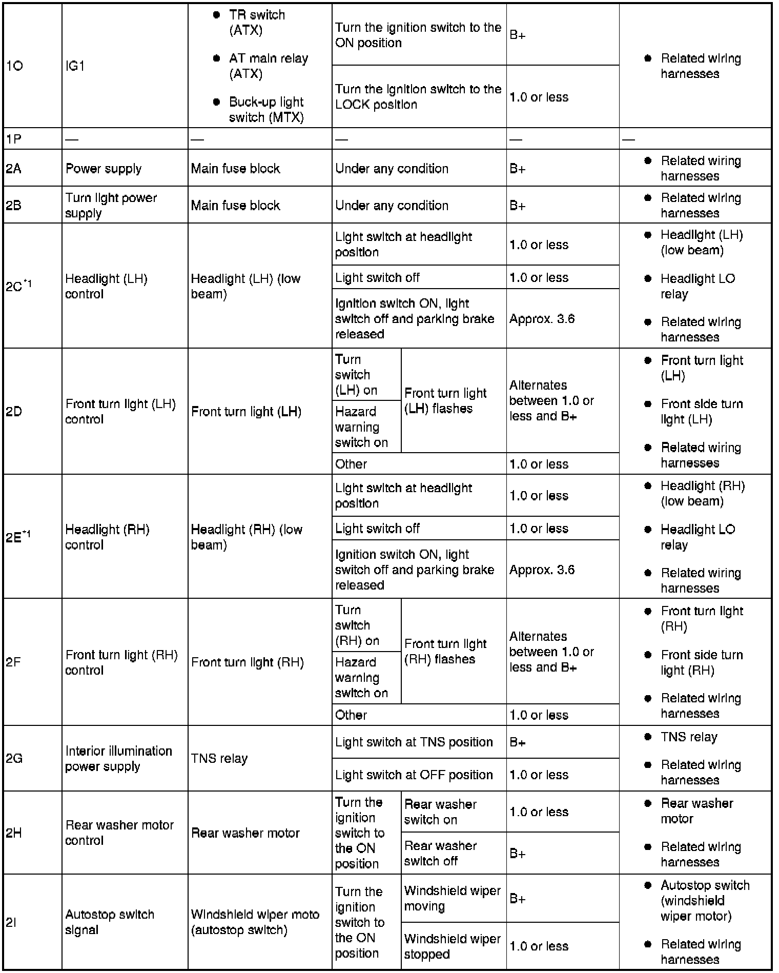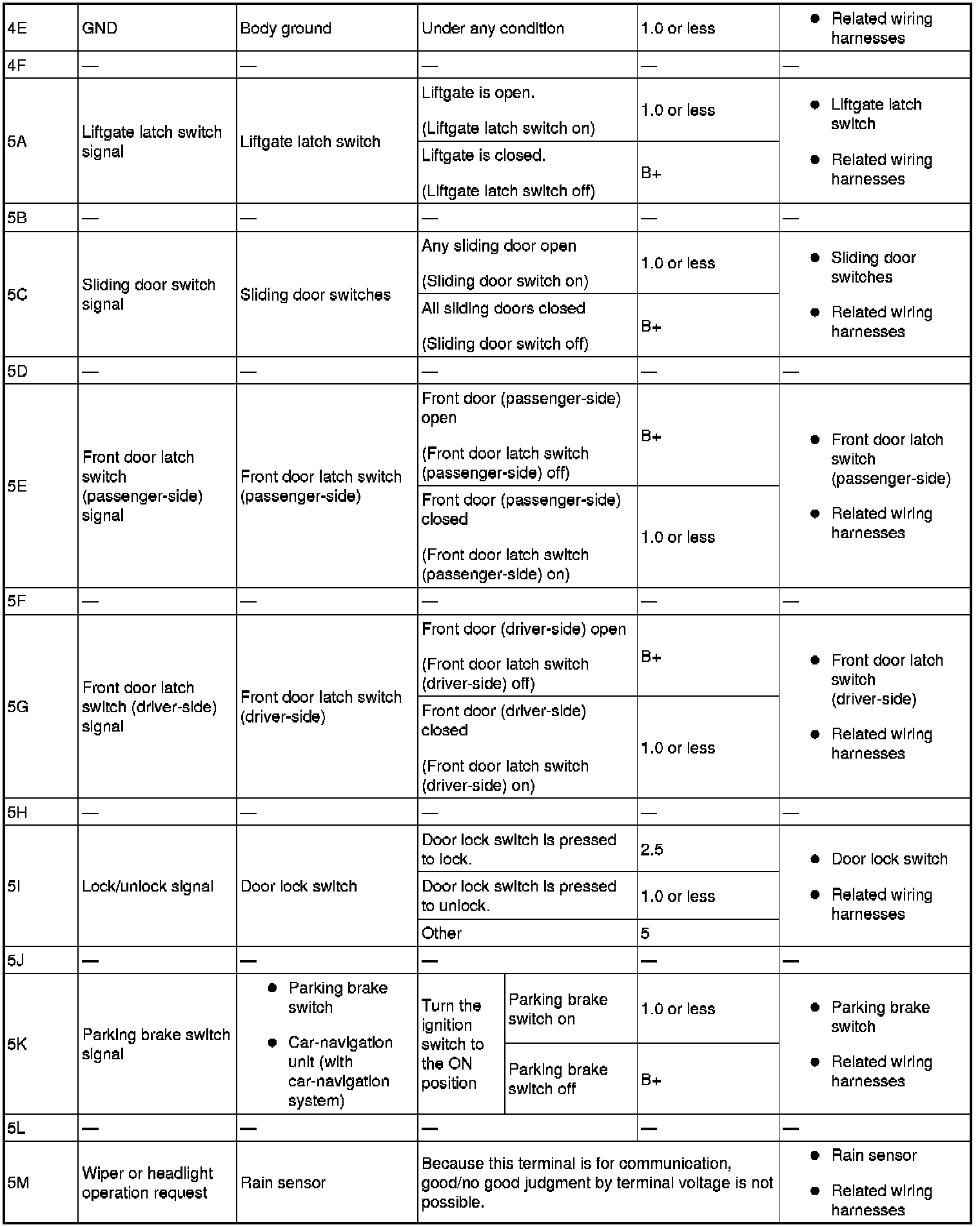 - If the voltage or continuity is not as specified in the Terminal Voltage Table (Reference), inspect the parts under "Inspection item (s)".