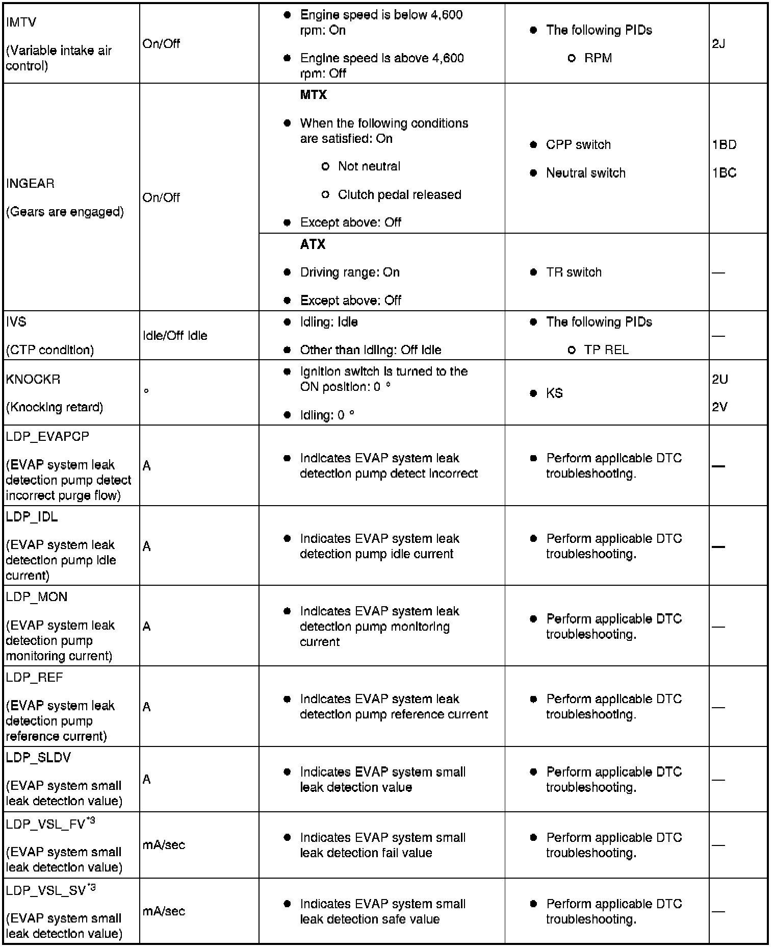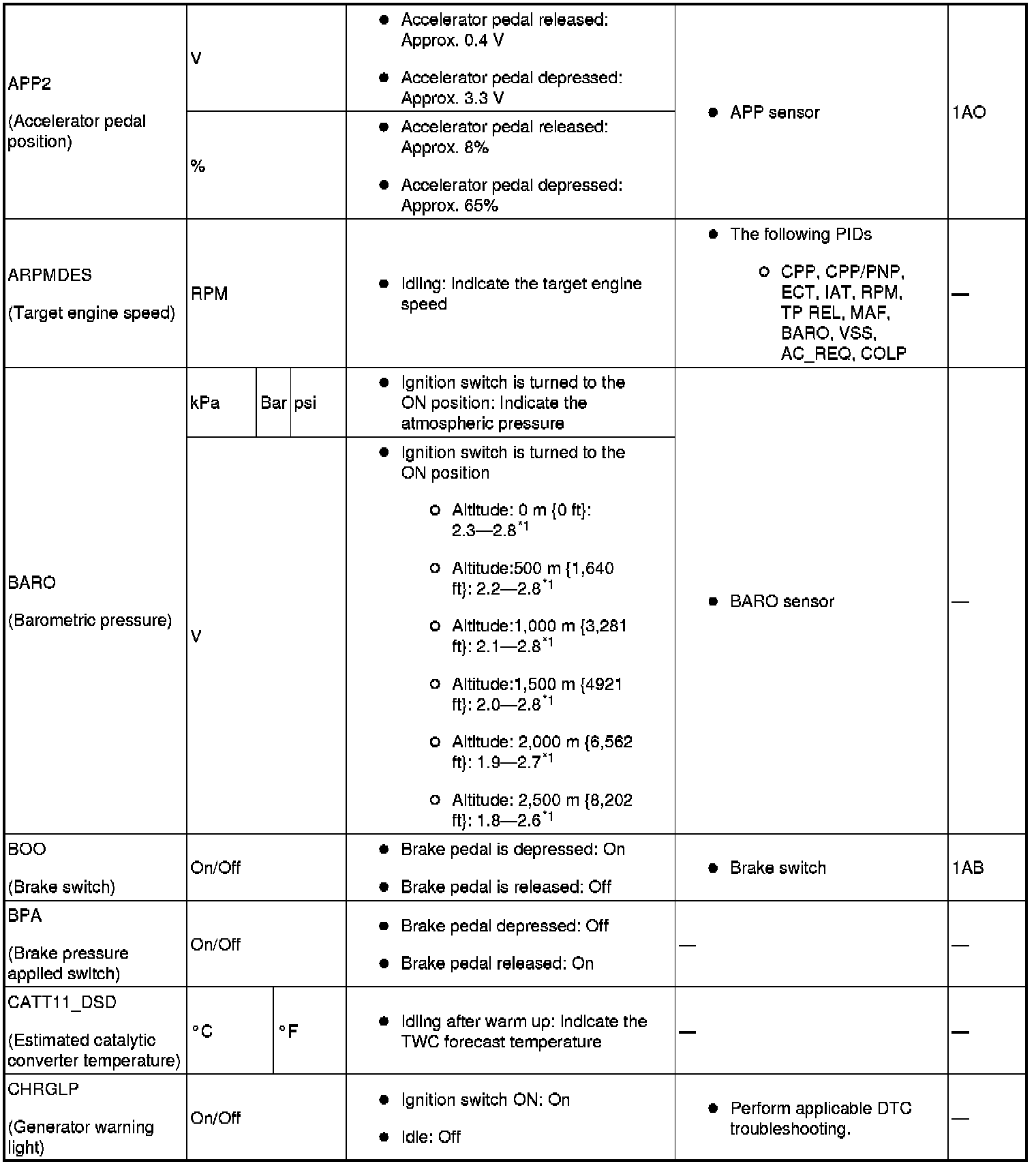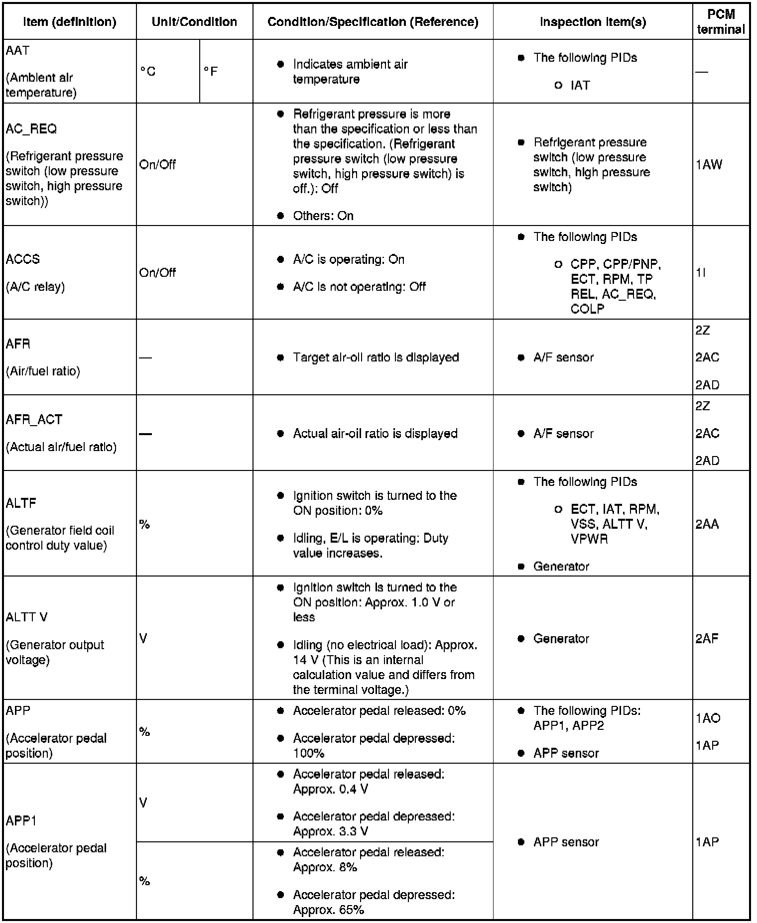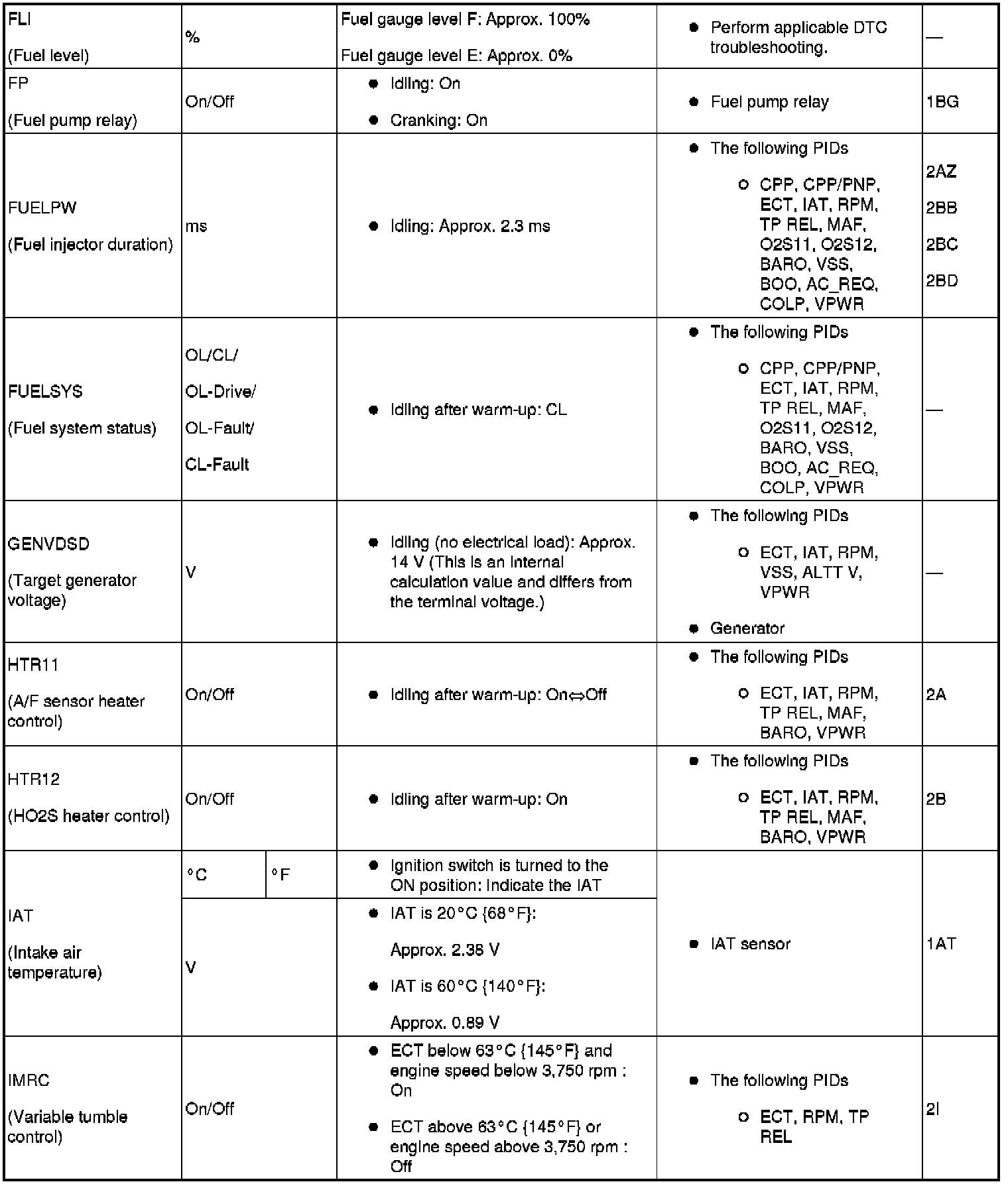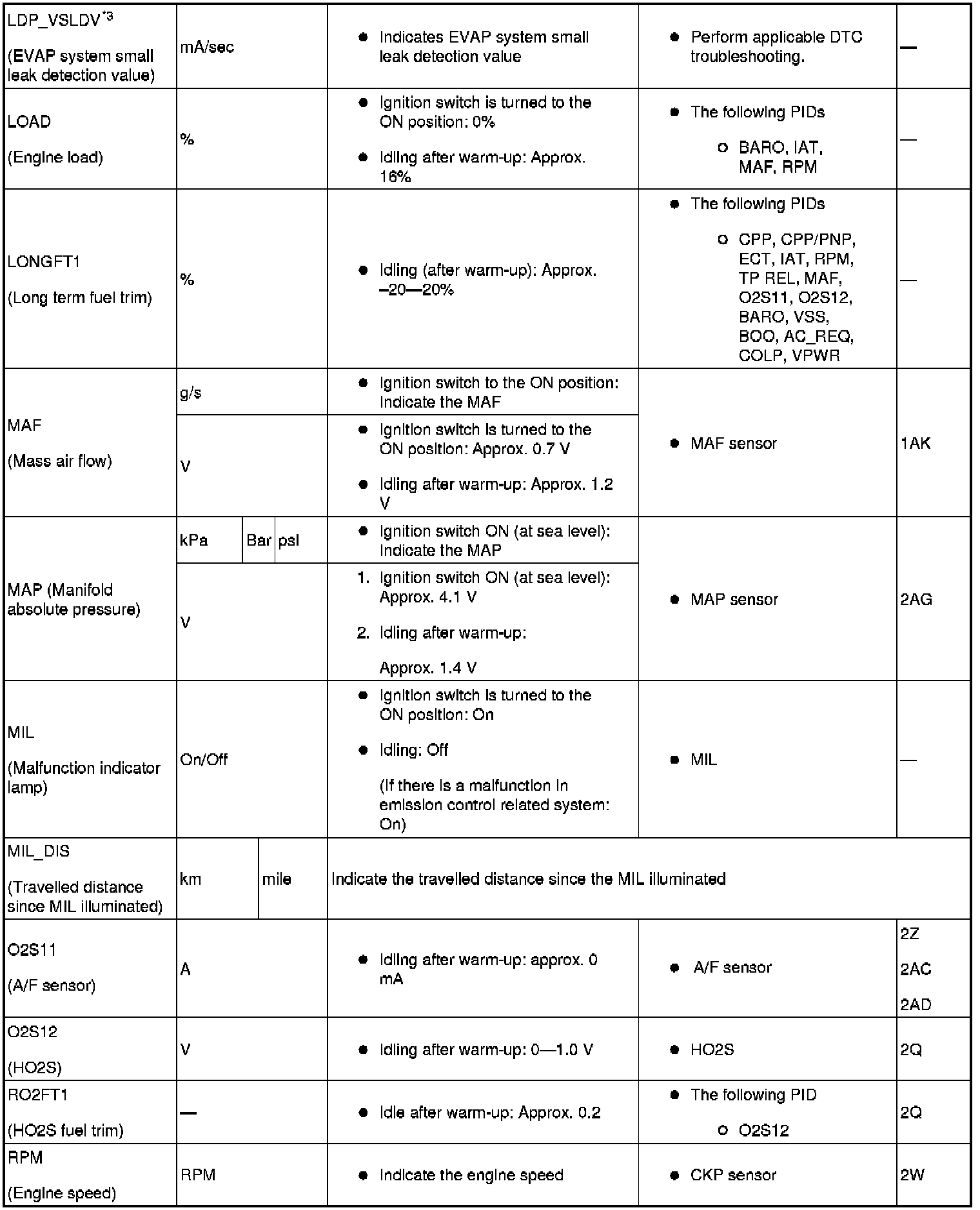 Home >> Mazda >> 2010 >> 5 L4-2.3L >> Repair and Diagnosis >> Powertrain Management >> Computers and Control Systems >> Engine Control Module >> Testing and Inspection >> Pinout Values and Diagnostic Parameters >> PID/Data Monitor Table