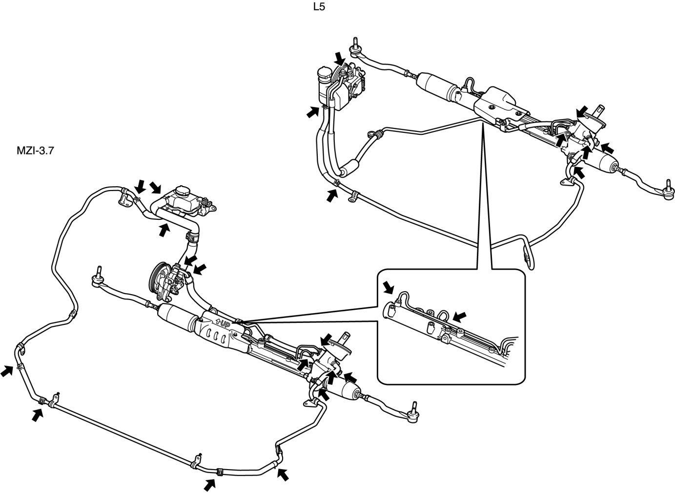 10. Turn the steering wheel fully to the left and right, then measure the fluid pressure generated at the gear housing.