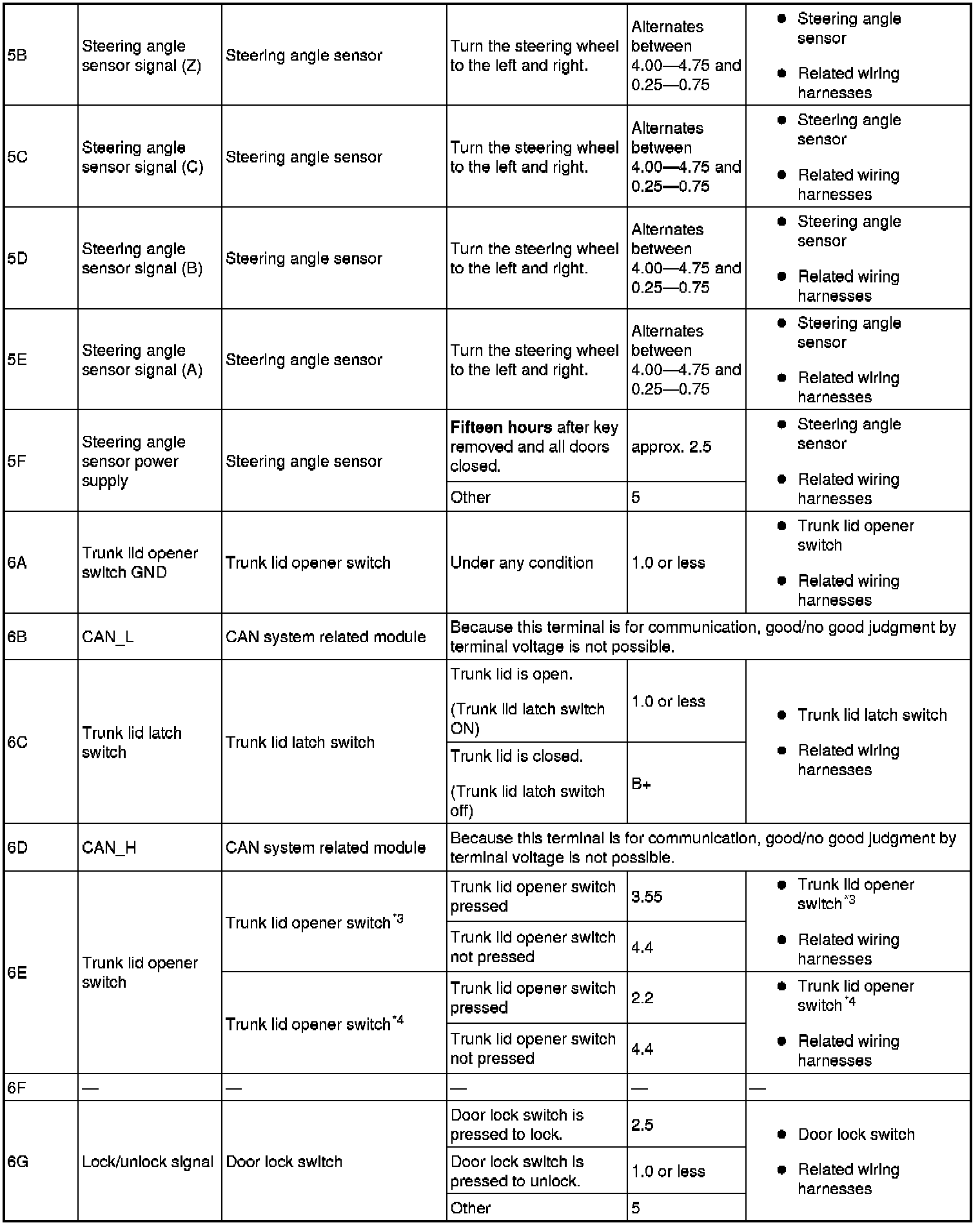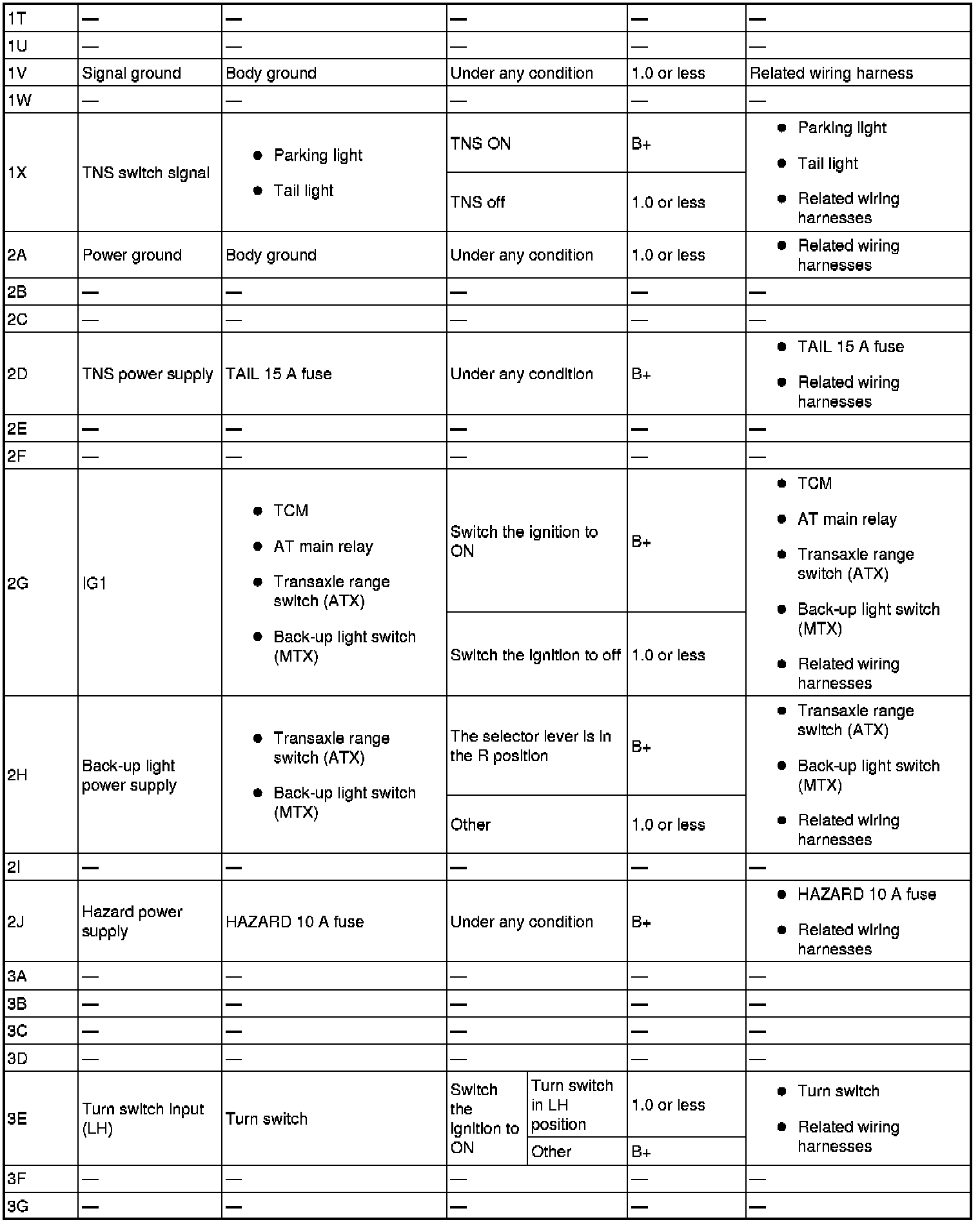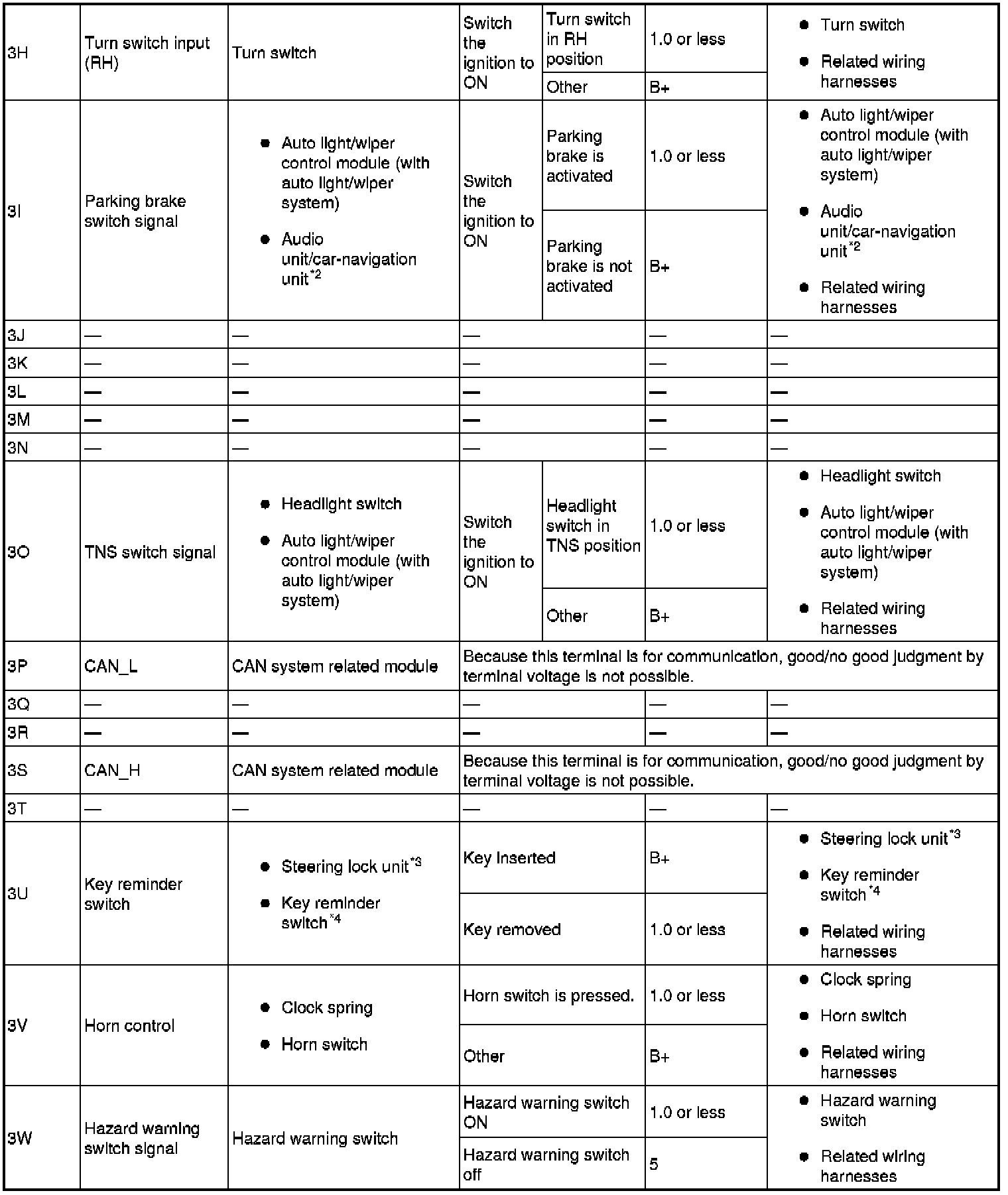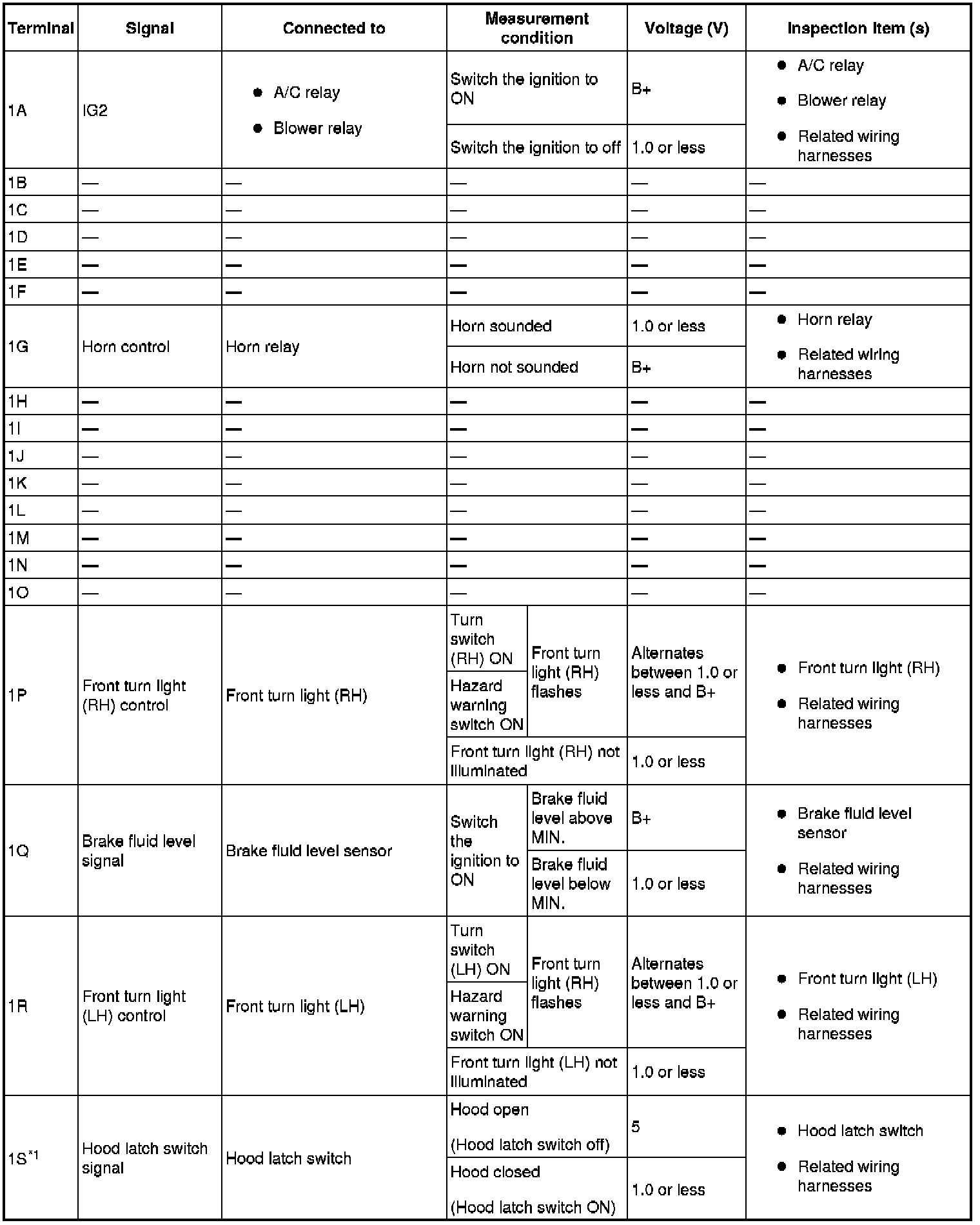 - If the voltage is not as specified in the Terminal Voltage Table, inspect the parts under "Inspection item (s)".