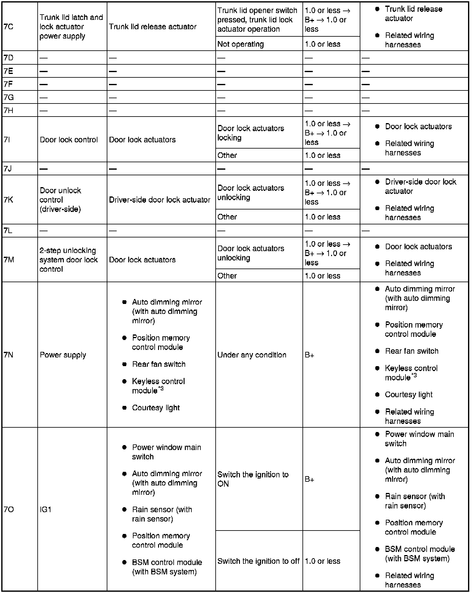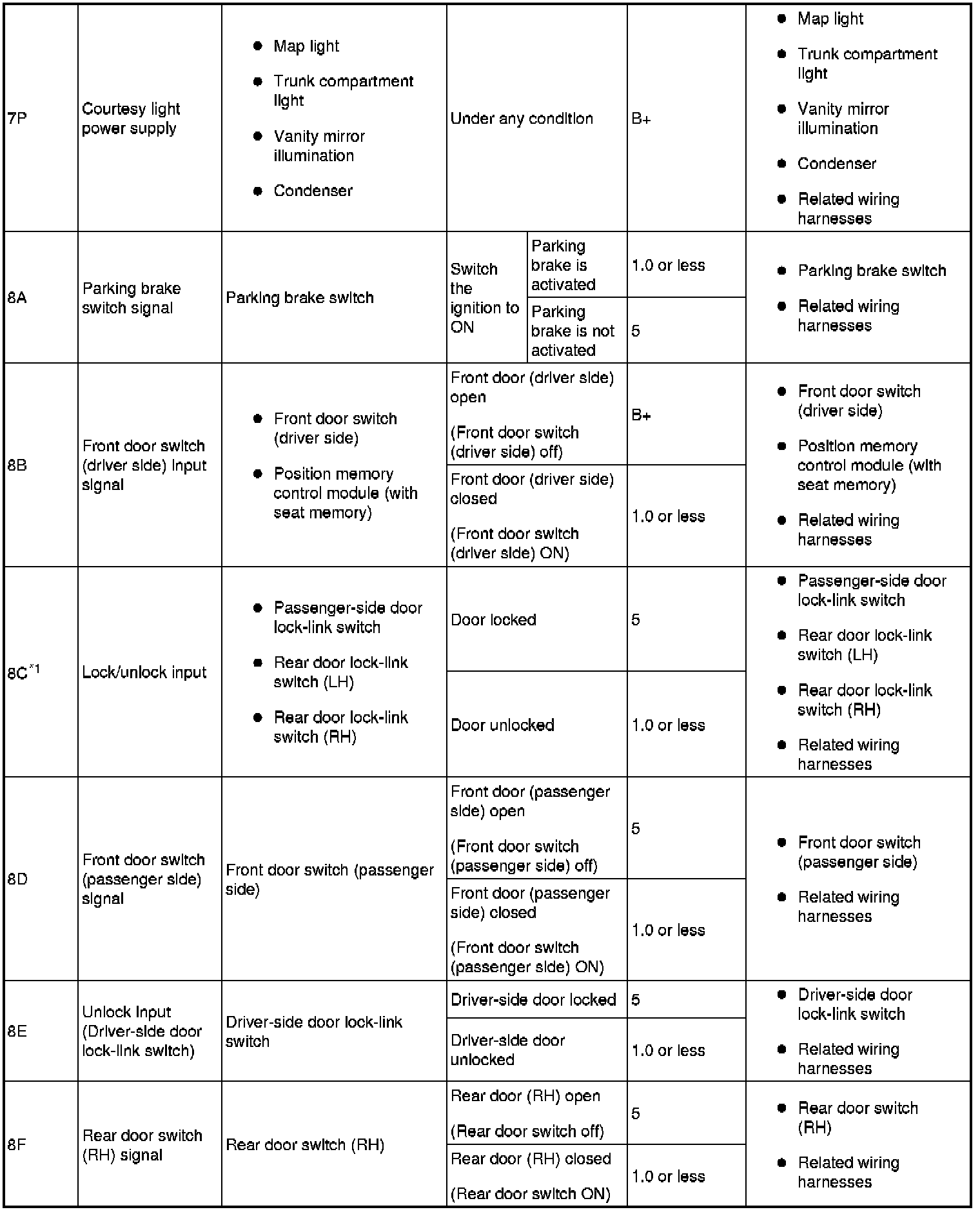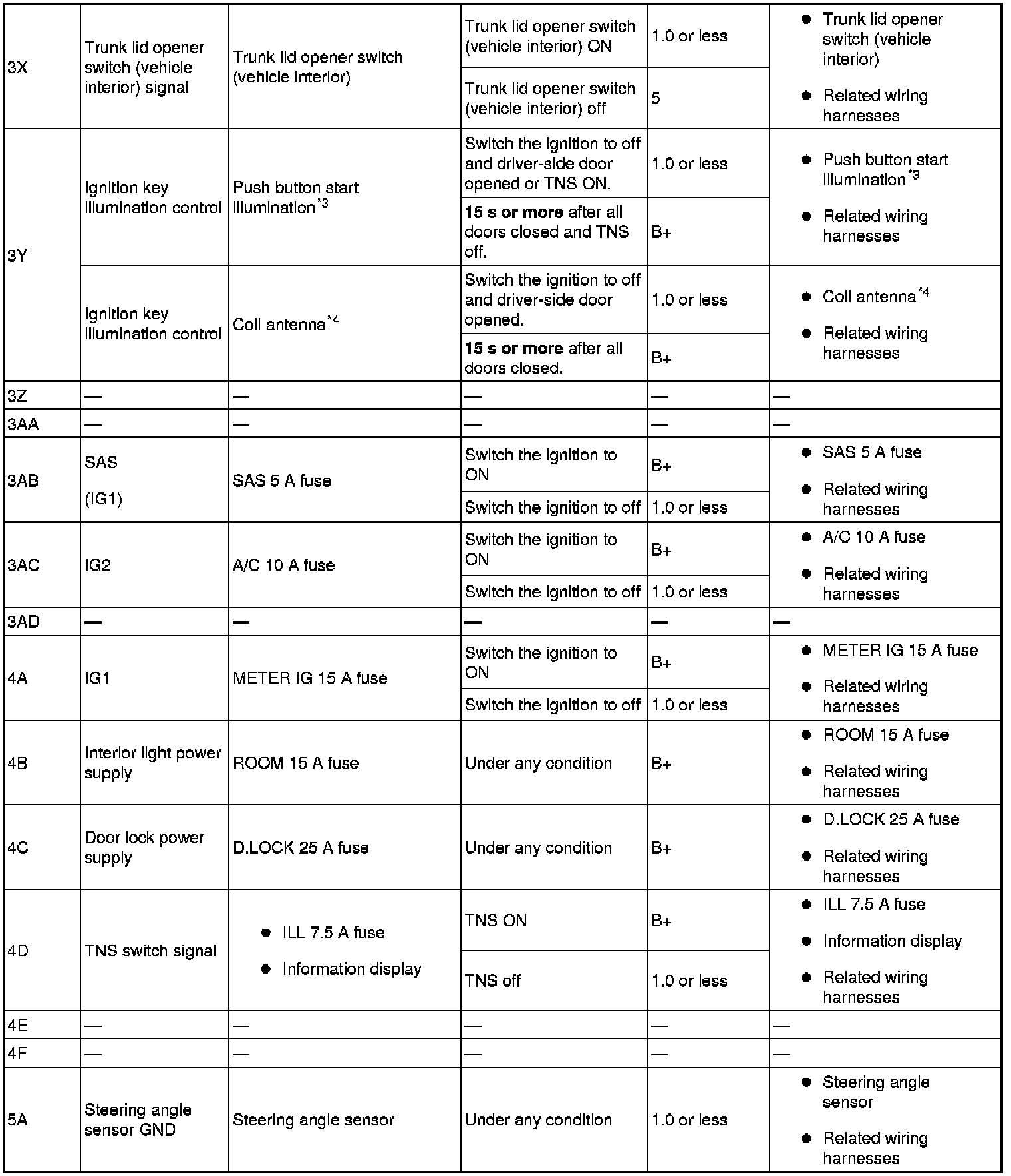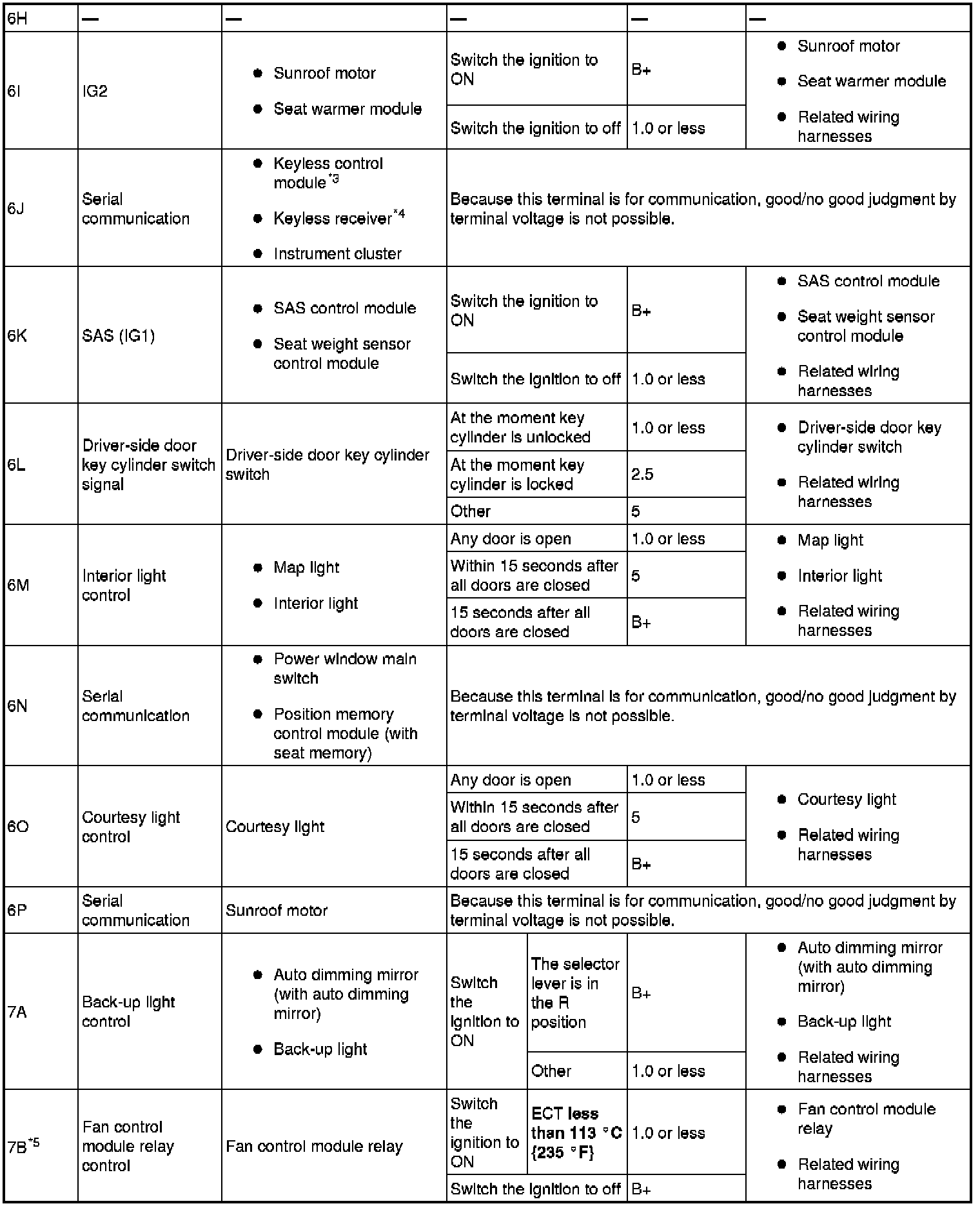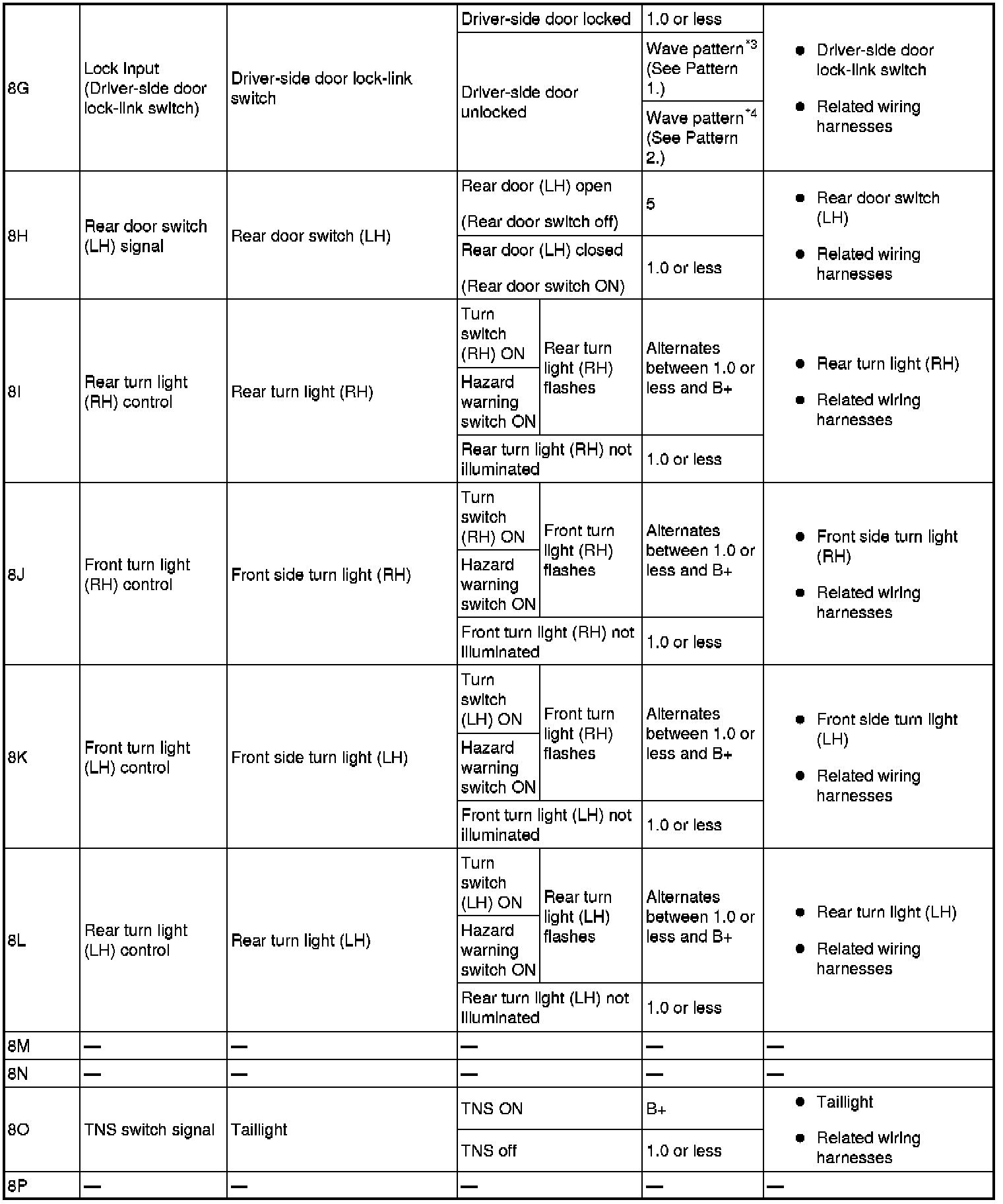 - If the voltage is not as specified in the Terminal Voltage Table, inspect the parts under "Inspection item (s)".