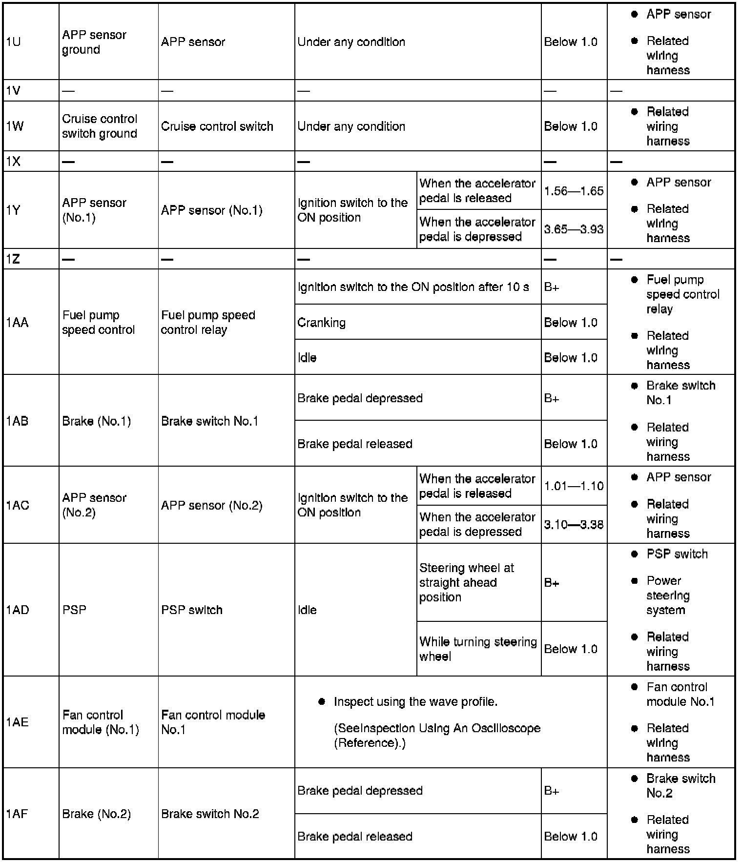 - For input/output signals except those of the monitoring items, use a voltmeter to measure the PCM terminal voltage.
