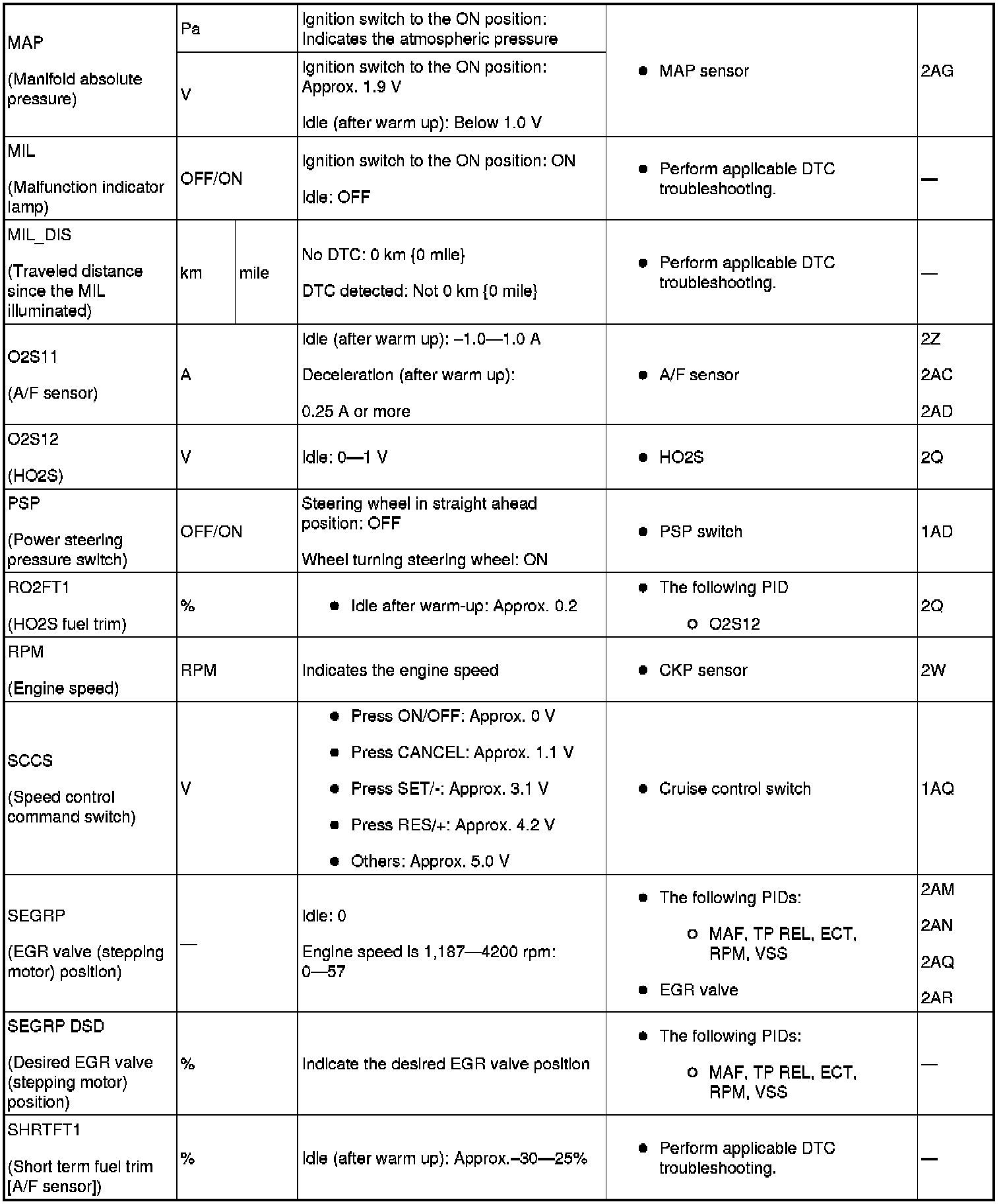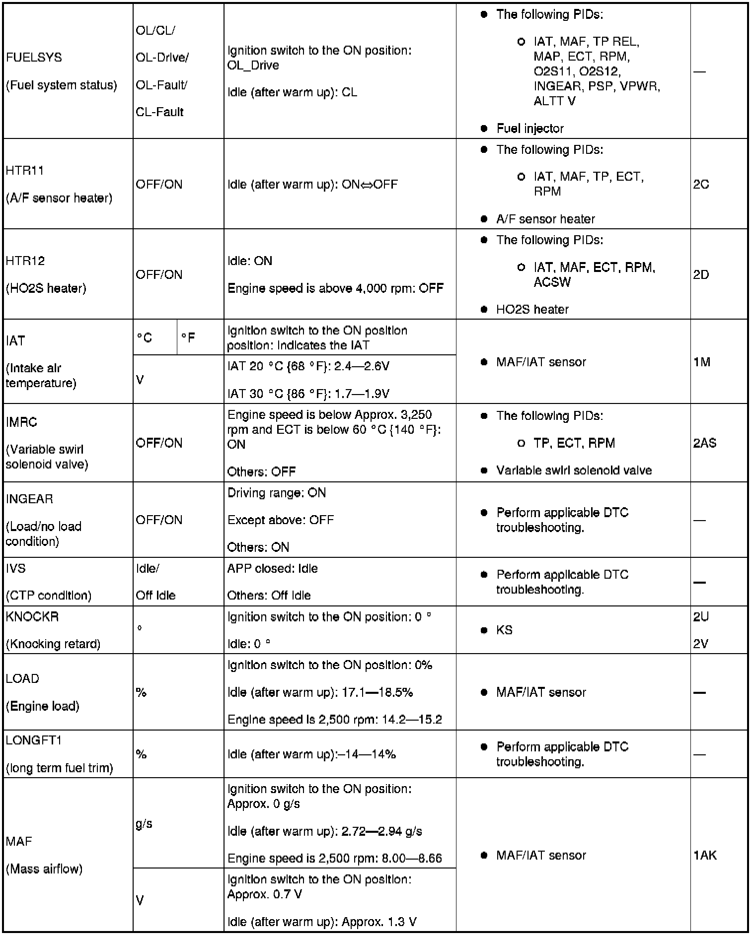 - If PID value is not within the specification, follow the instructions in the "Inspection item" column.