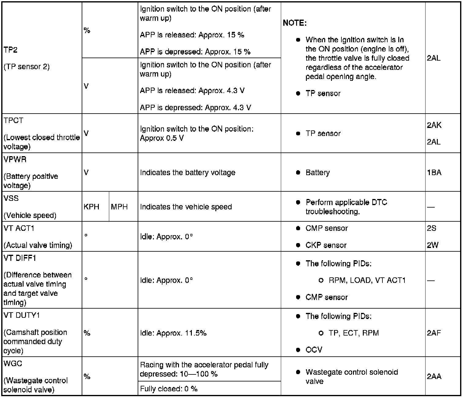 - ACCS, ALTF, ARPMDES, EVAPCP, EVAPCV, FAN_DUTY, FAN_DUTY2, FP, IMRC, INJ_1, INJ_2, INJ_3, INJ_4, SEGRP, TEST, VT DUTY1 Wt, WGC
