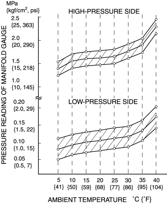 10. Verify that the intersection of the pressure reading of the manifold gauge and ambient temperature is in the shaded zone.