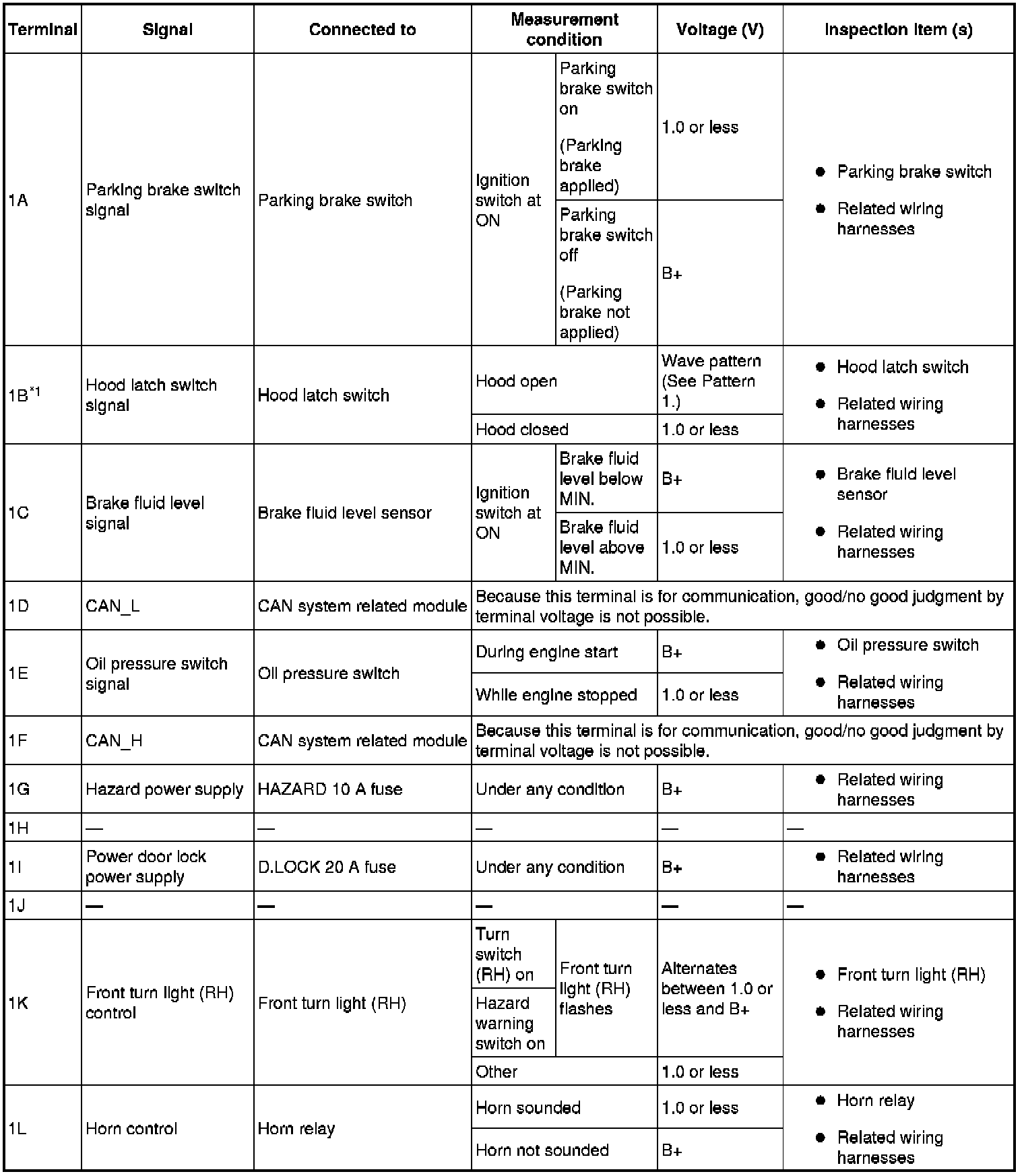 - Hood latch switch signal: 1B (+) - body ground (-)