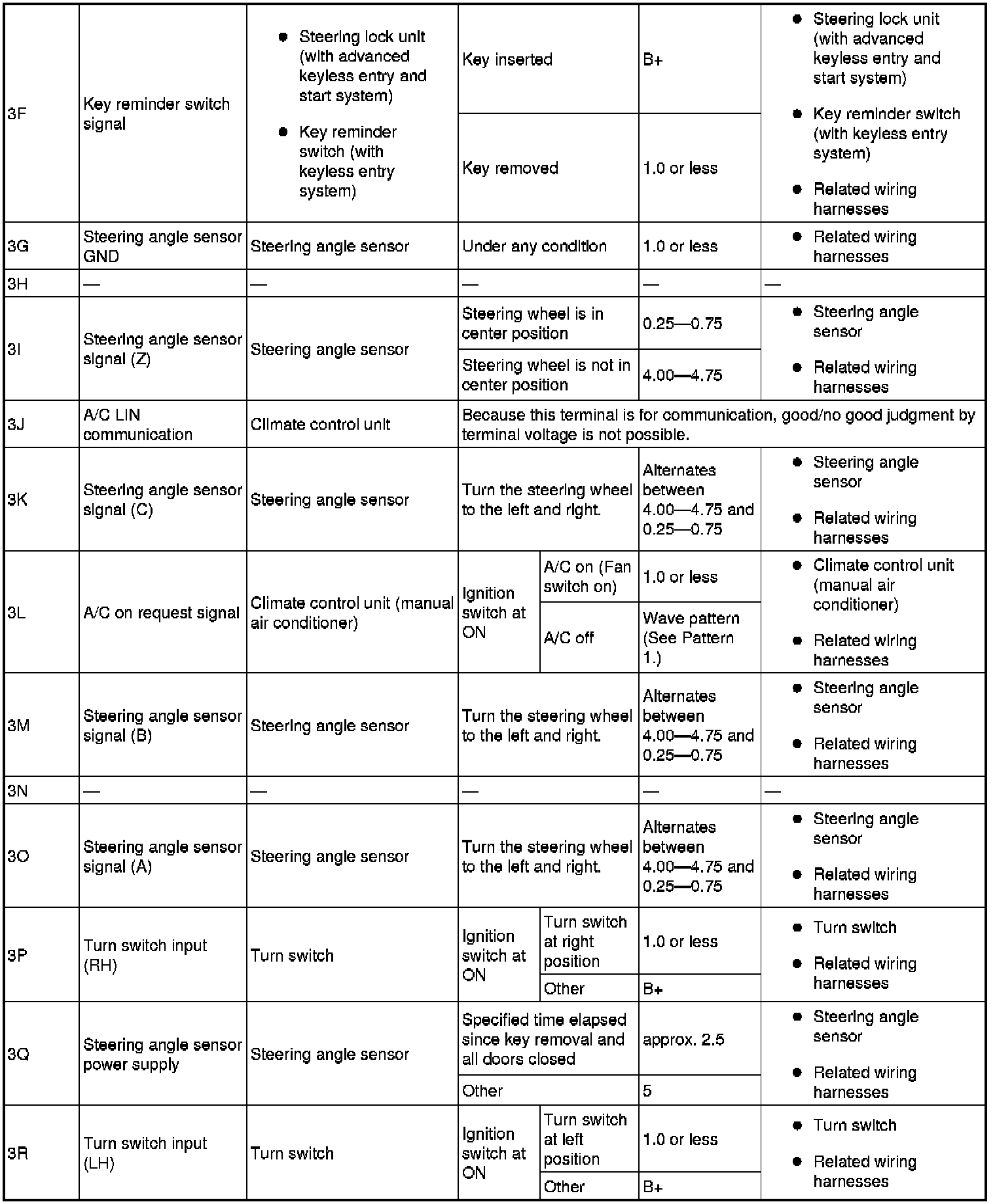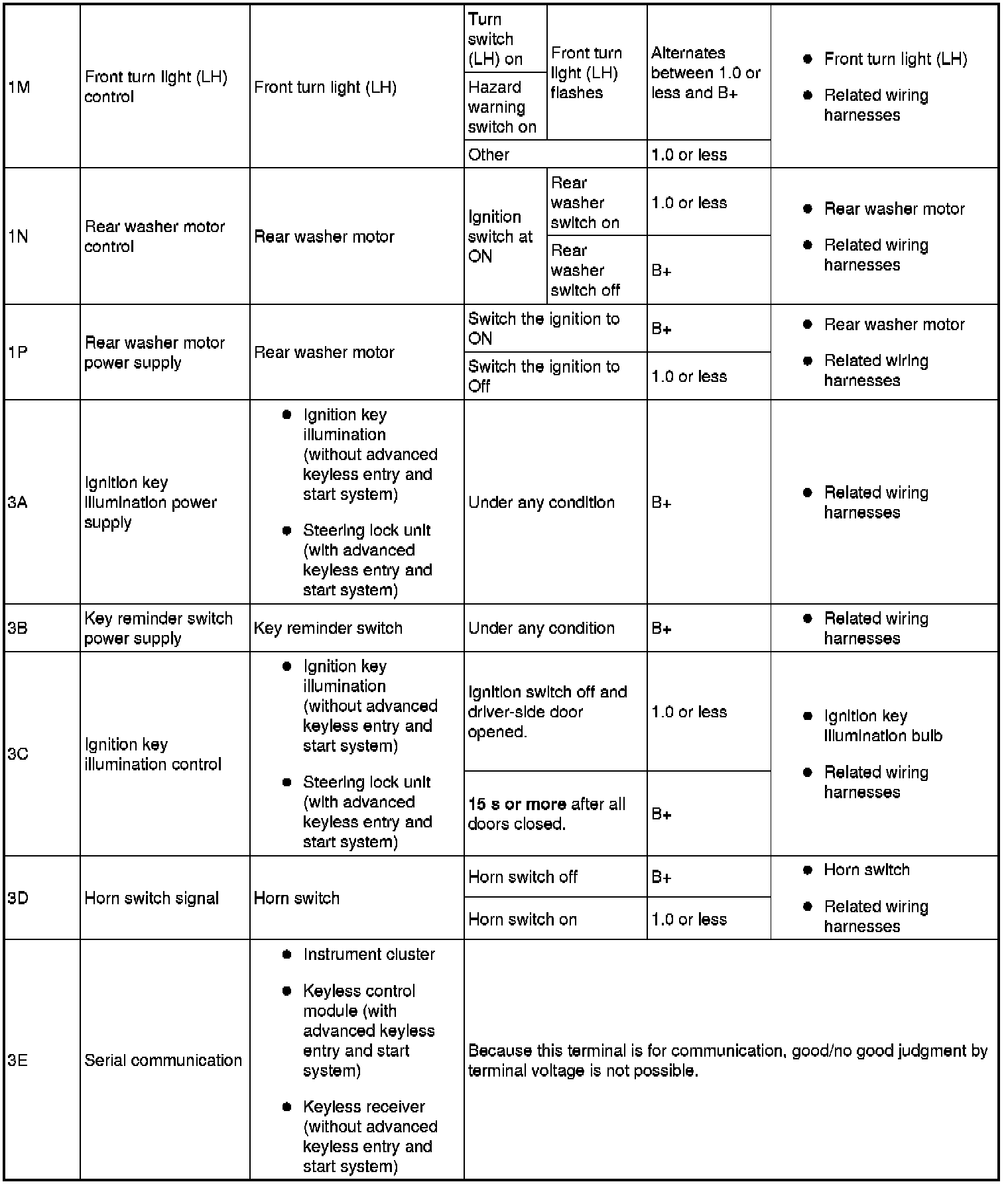 - If the voltage is not as specified in the Terminal Voltage Table, inspect the parts under "Inspection item (s)".