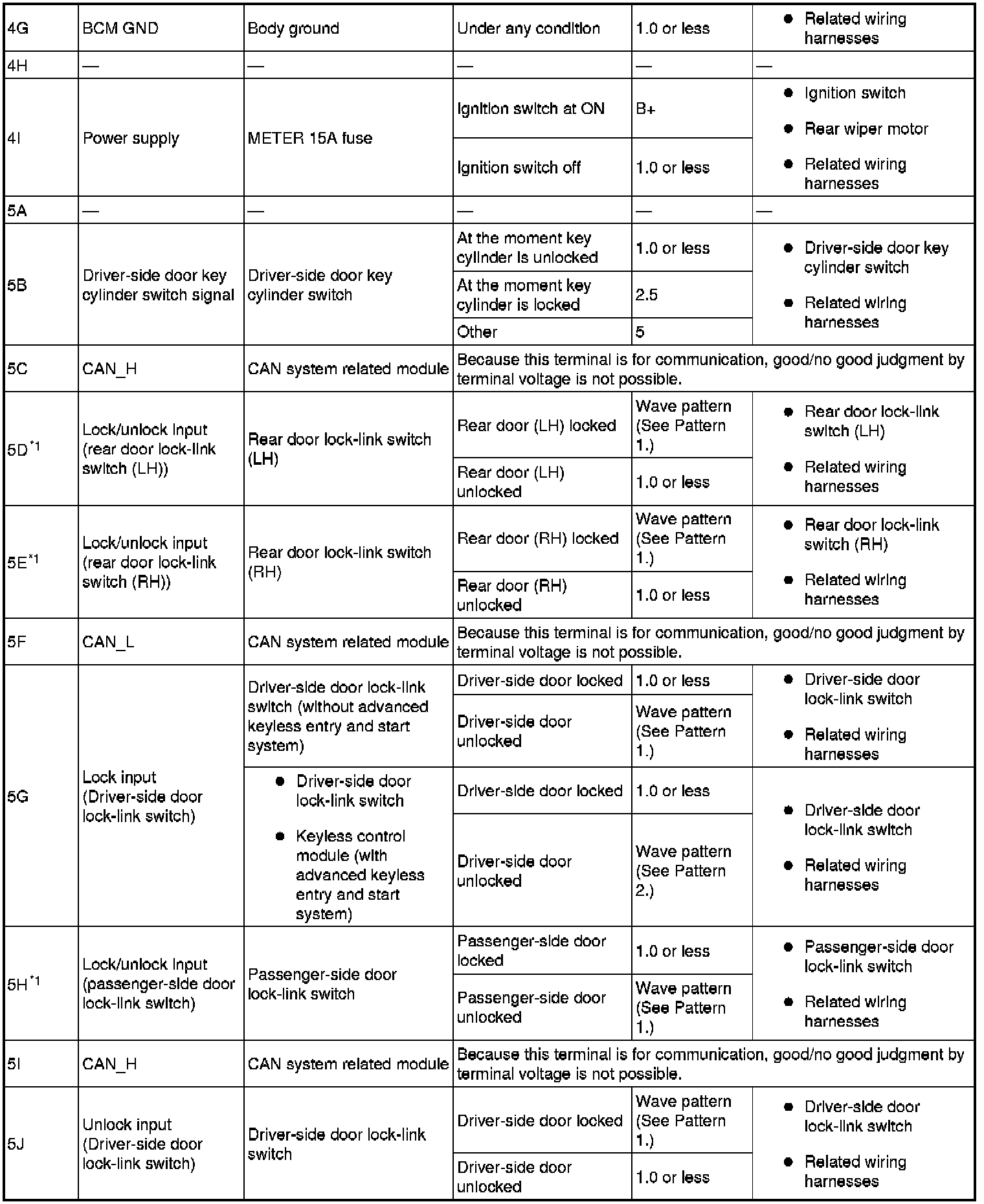 - Lock/unlock input (rear door lock-link switch (LH)): 5D (+) - body ground (-)