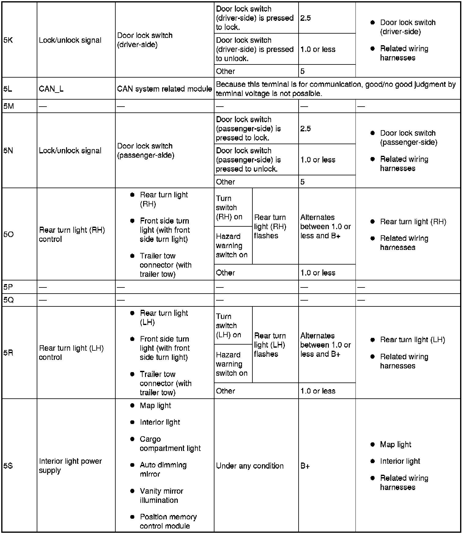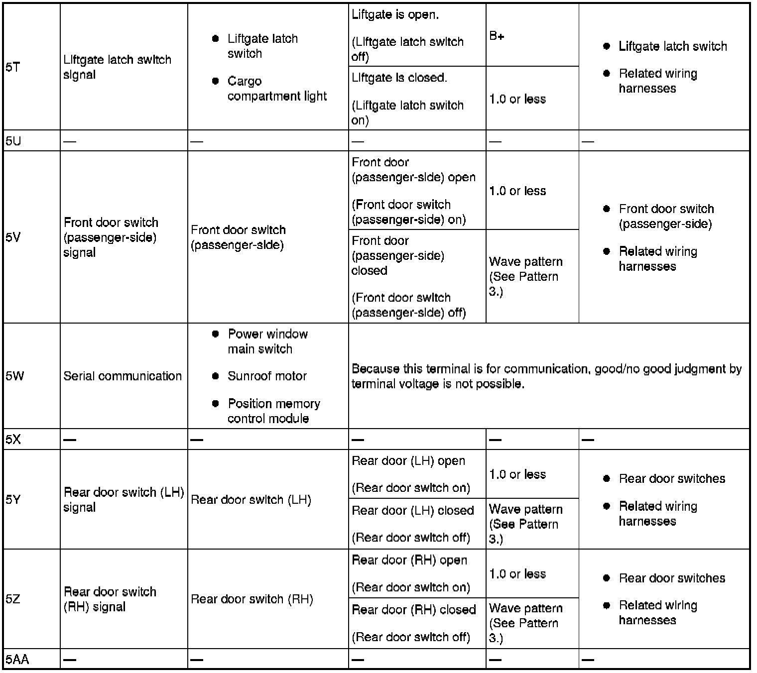 - Rear door switch (RH) signal: 5Z (+) - body ground (-)