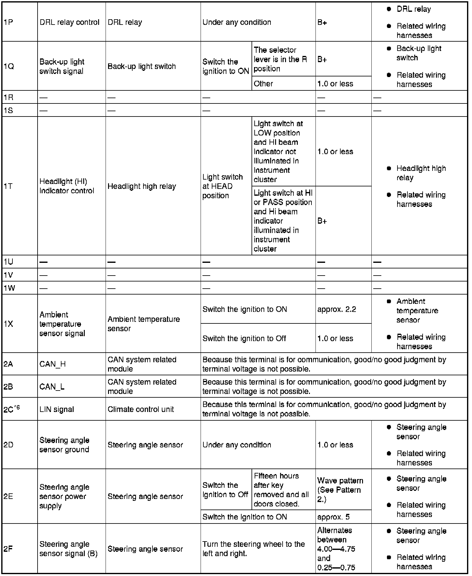 - If the voltage or continuity is not as specified in the Terminal Voltage Table, inspect the parts under "Inspection item (s)".