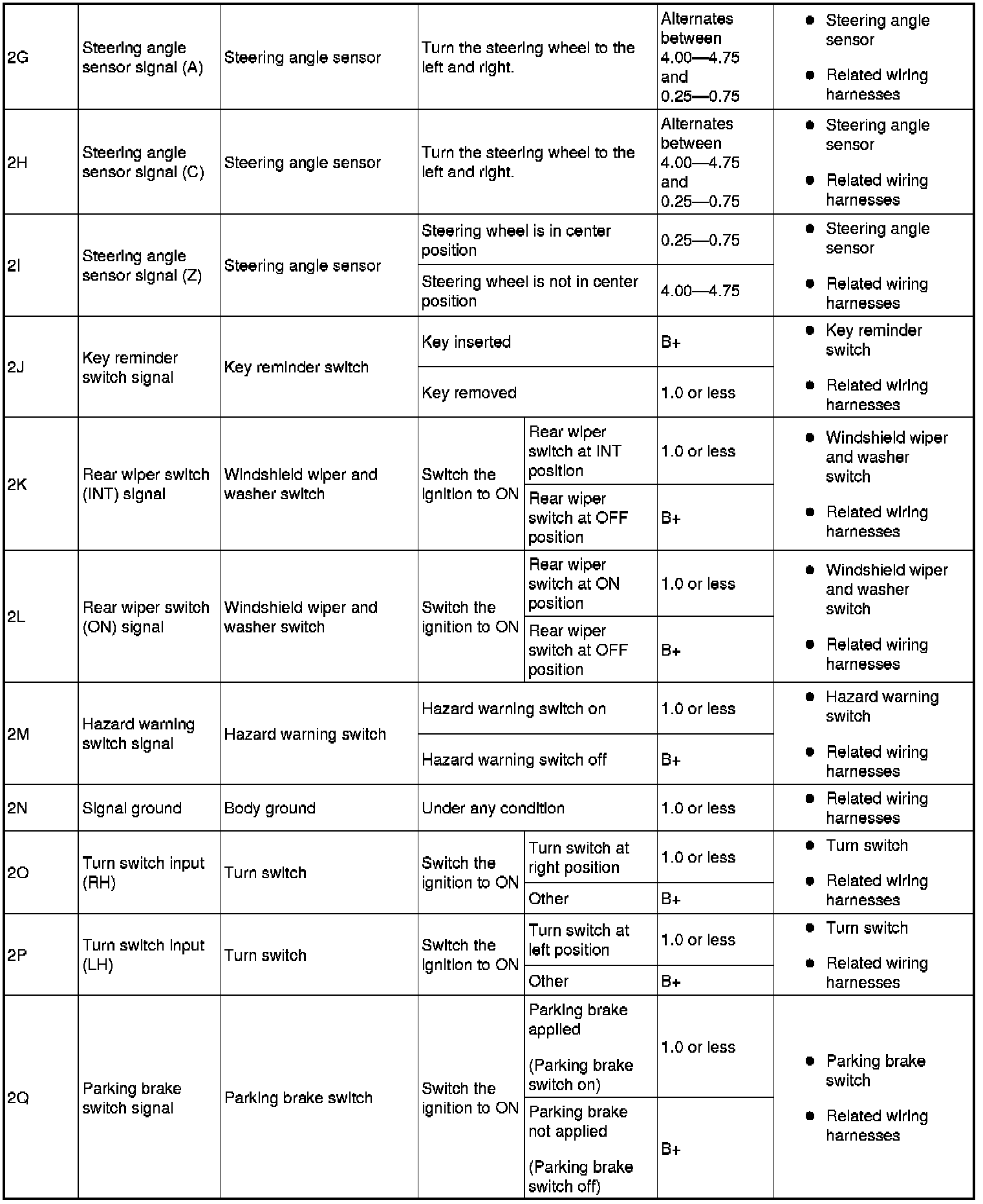 - Rear door switch (RH) signal: 6K (+) and body ground (-)