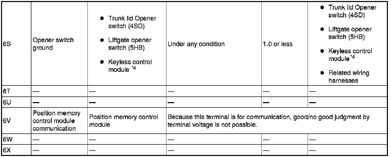 - Lock/unlock input (passenger-side door lock-link switch) (rear door lock link switch (RH, LH)): 6J (+) and body ground (-)