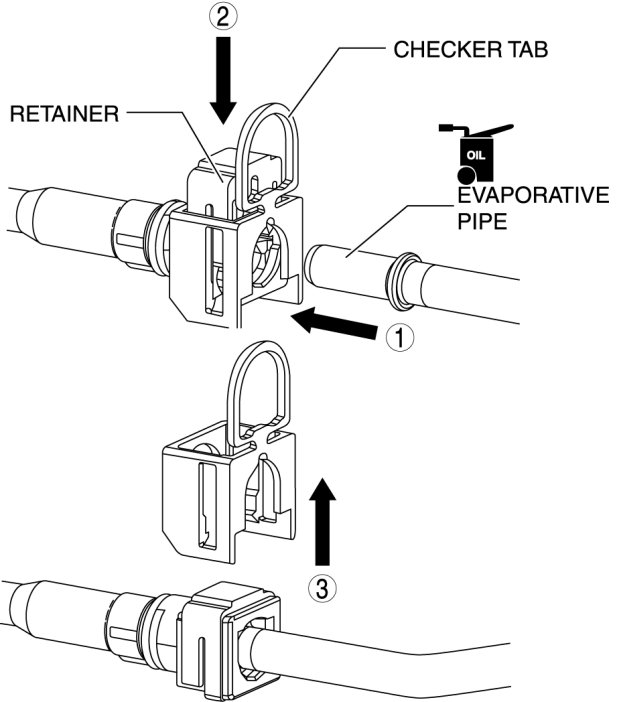 - A checker tab is integrated with the quick release connector for new evaporative hoses and evaporative hoses. Remove the checker tab from the quick release connector after the connector is completely engaged with the evaporative pipe.