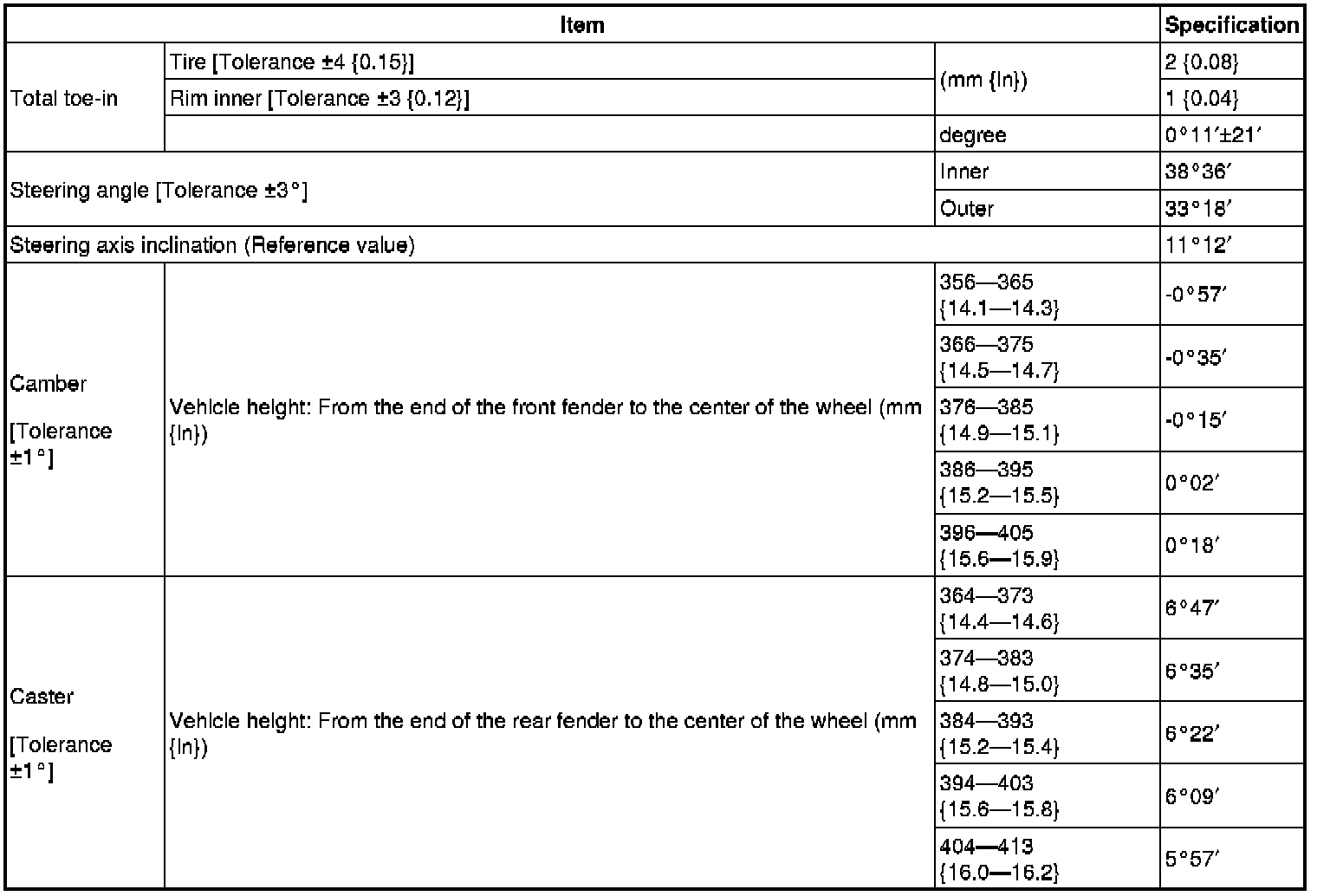- Difference between the left and right dimension for camber and caster is within 1°.