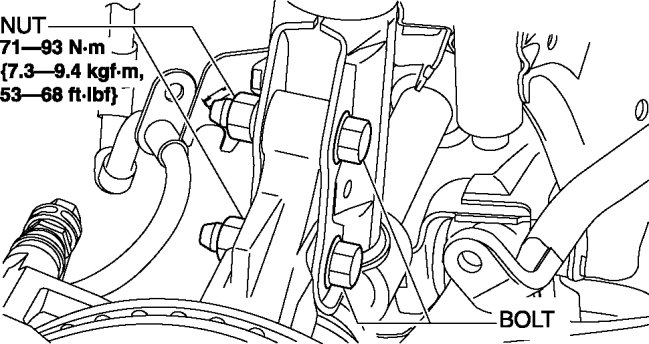 8. Install the brake hose bracket to the shock absorber, then tighten the bolt to the specified torque.
