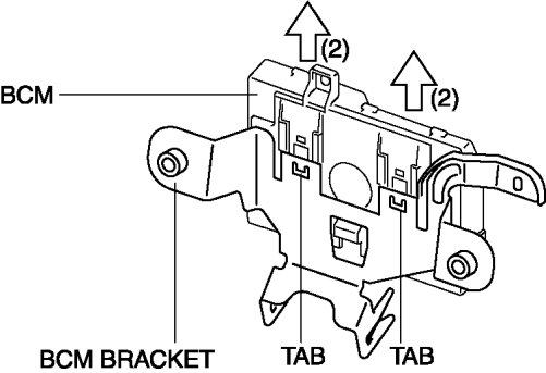 6. Pull the BCM in the direction of the arrow (2) as shown in the figure and remove the BCM bracket.