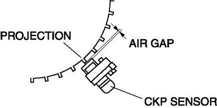 2. Using a thickness gauge, measure the air gap between the plate projections at the back of crankshaft pulley and the CKP sensor.