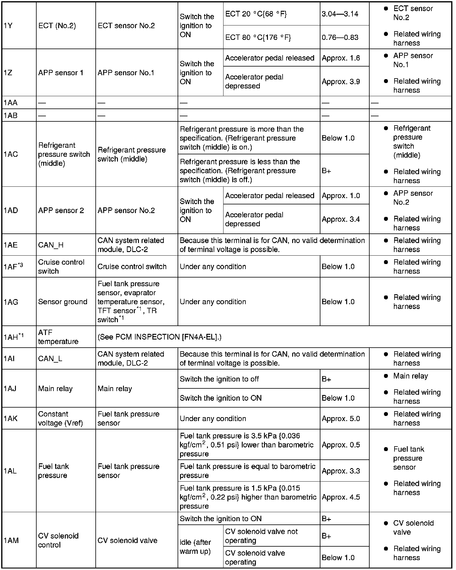 - The PCM terminal voltages vary with change in measuring conditions and vehicle conditions. Always carry out a total inspection of the input systems, output systems, and PCM to determine the cause of trouble. Otherwise, a wrong diagnosis will be made.