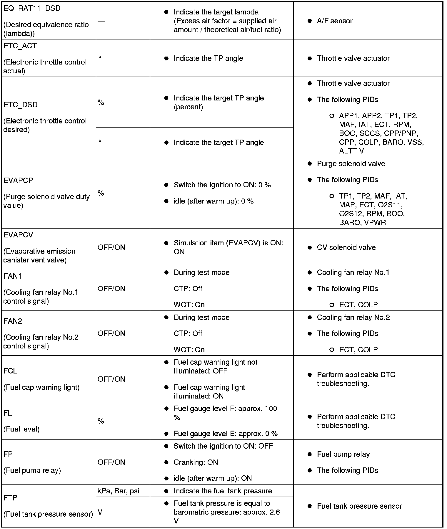 - The simulation items that are used in the ENGINE CONTROL SYSTEM OPERATION INSPECTION are as follows.