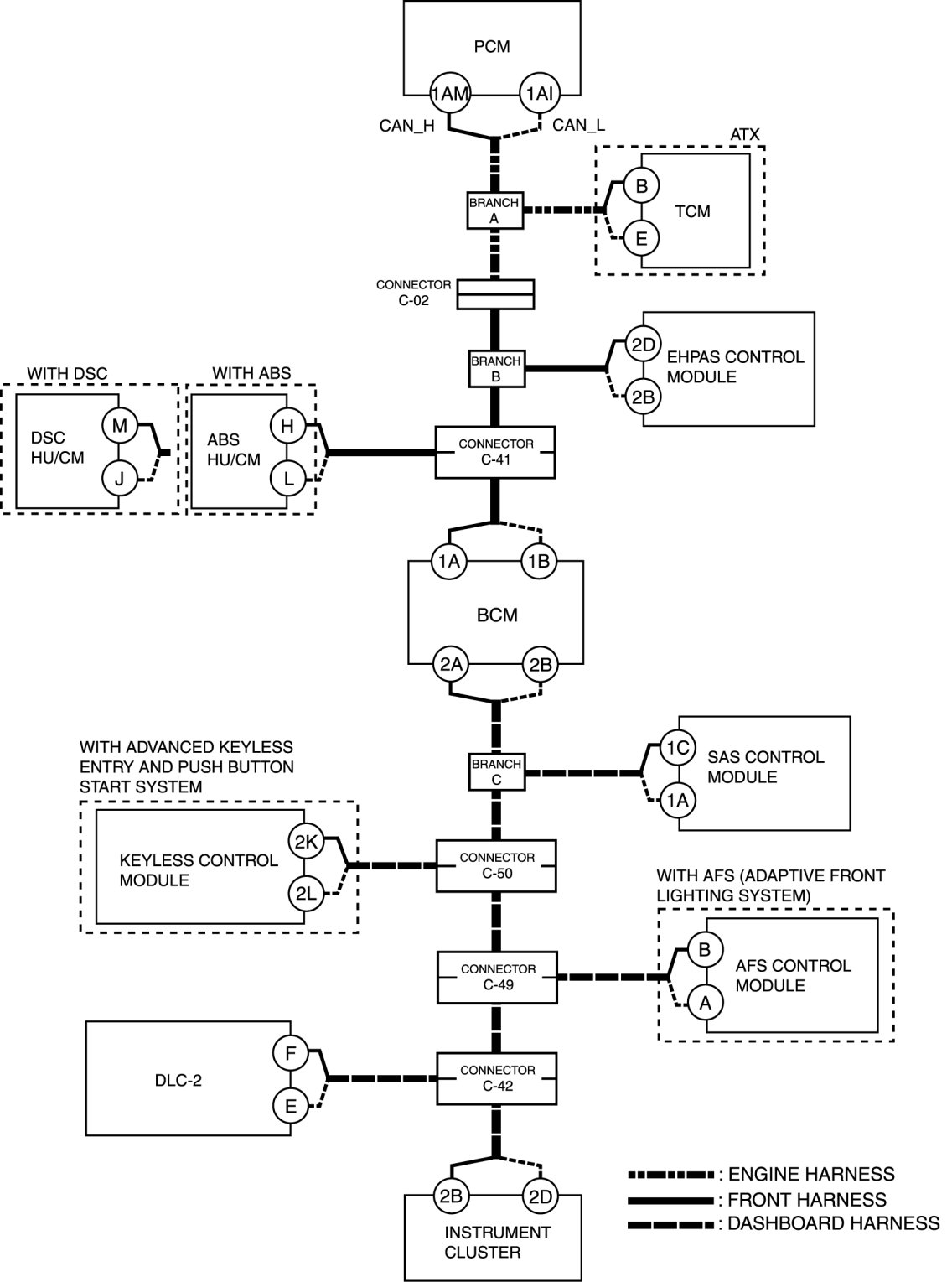 - Improper insertion, connector terminal damage, deformation, corrosion, or disconnection of PCM, BCM, connector C-02, connector C-41, connector C-50, connector C-49, or connector C-42