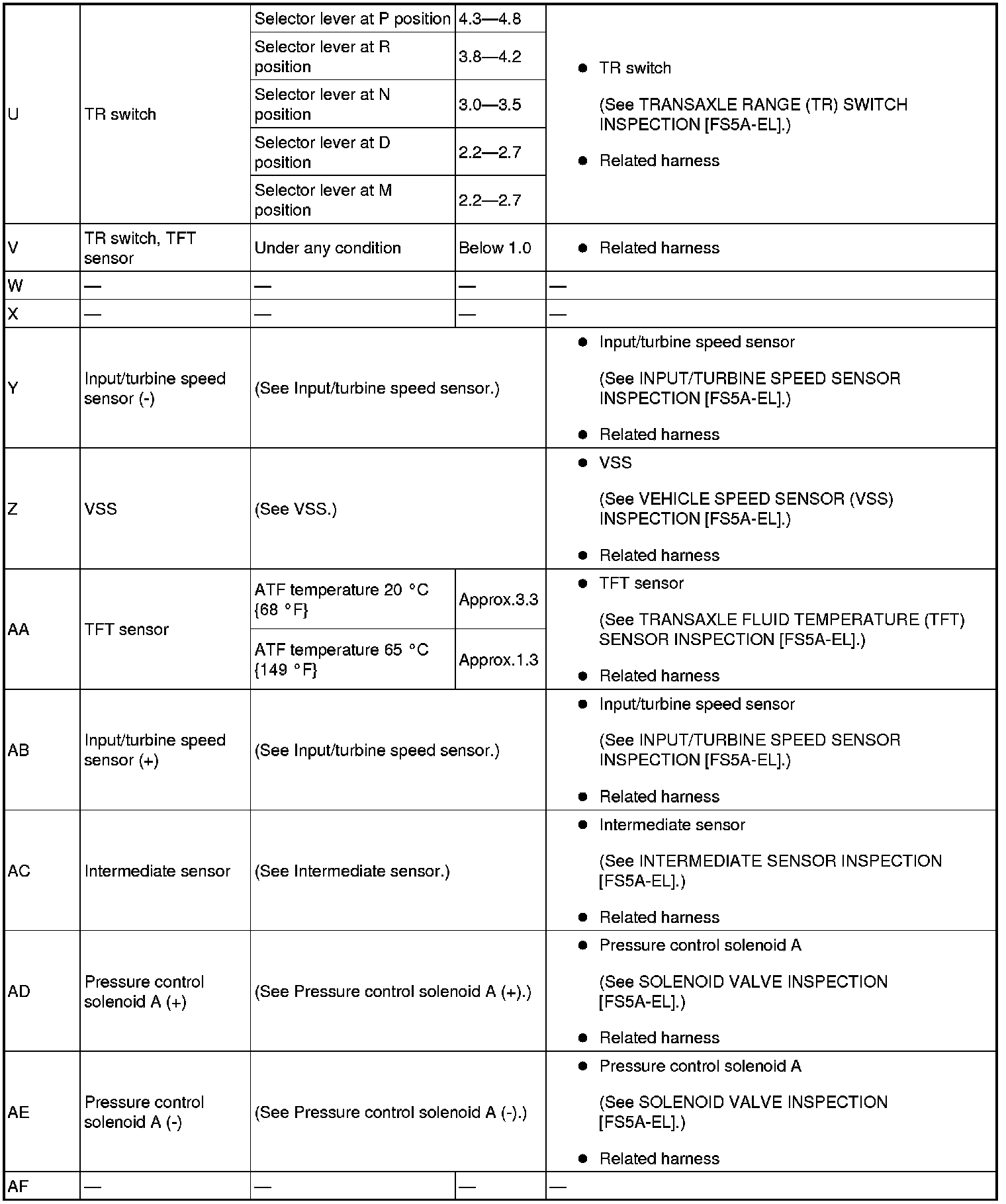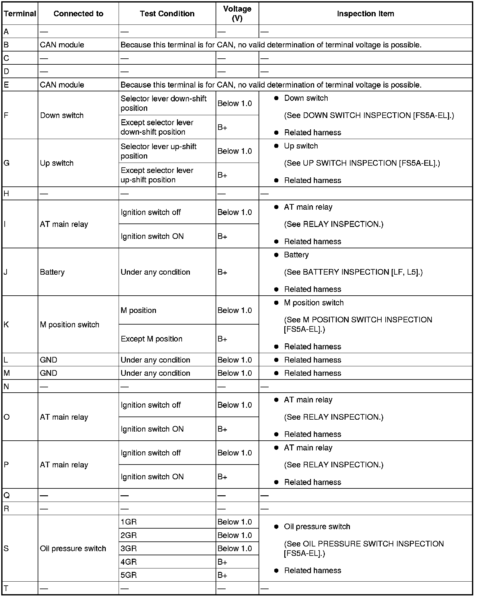- If any incorrect voltage is detected, inspect the related system(s), wiring harnesses and connector(s) referring to the "Inspection Item" column in the "TCM Terminal Voltage".