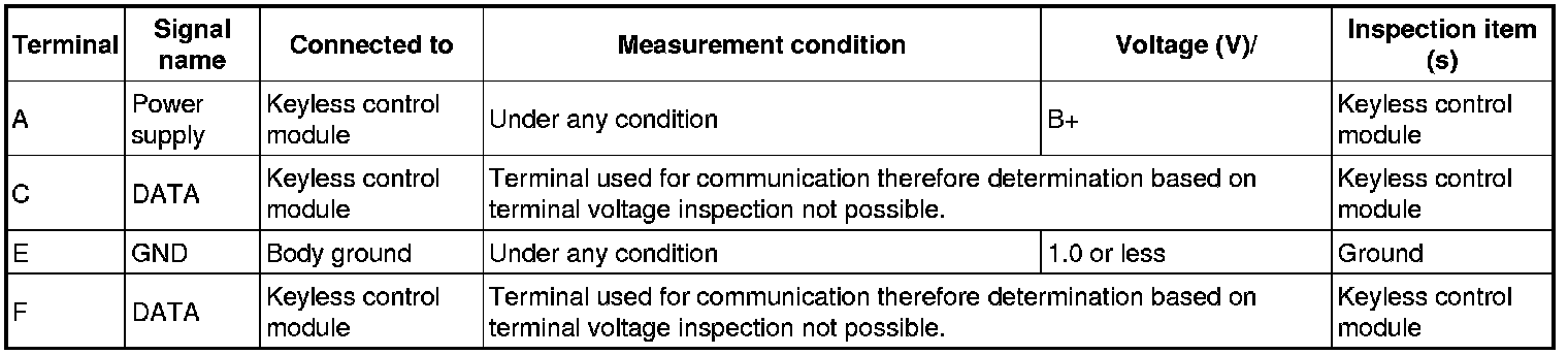 - If the voltages cannot be verified as indicated in the terminal voltage table, inspect the parts under "Inspection item (s)".