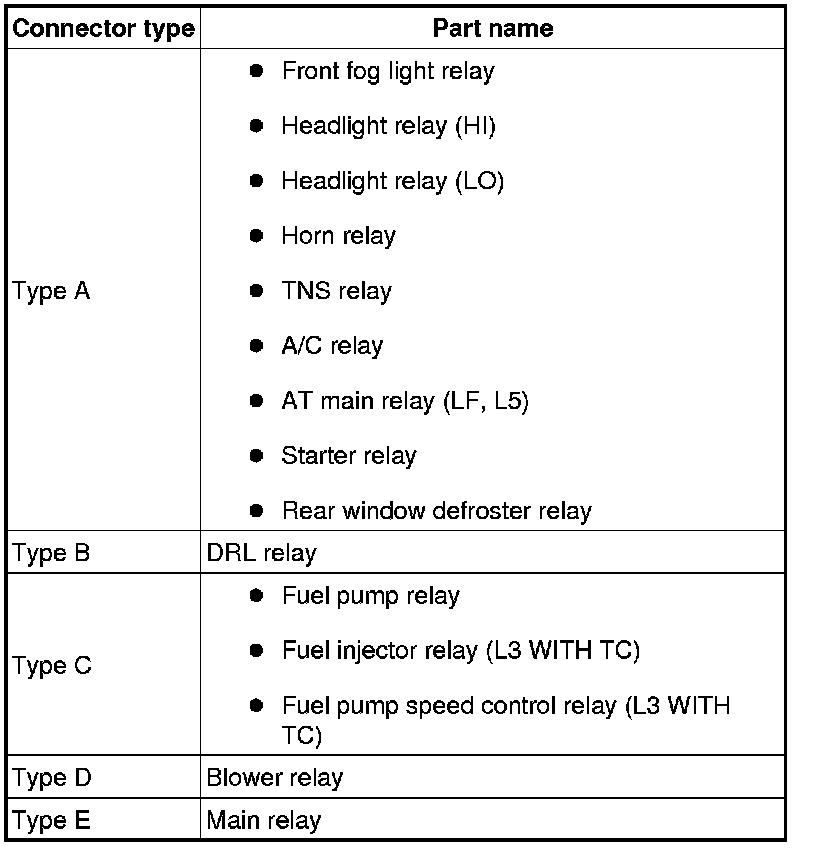 Home >> Mazda >> 2011 >> 3 L4-2.5L >> Repair and Diagnosis >> Power and Ground Distribution >> Relay Box >> Testing and Inspection >> Relay Inspection