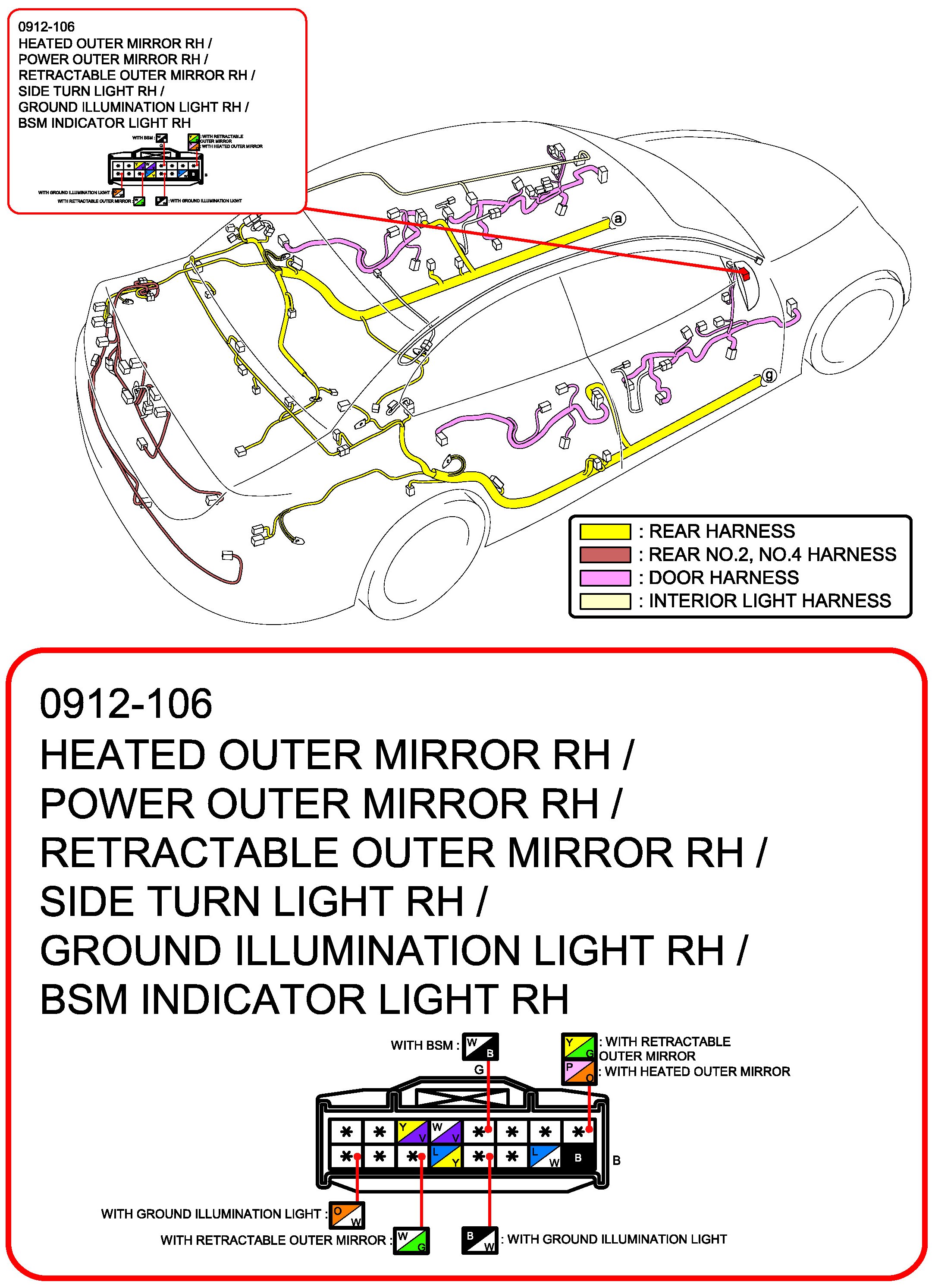Heated Outer Mirror RH/Power Outer Mirror RH/Retractable Outer Mirror RH/Side Turn Light RH/Ground Illumination Light RH/BSM Indicator Light RH