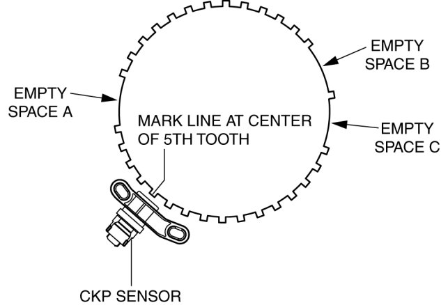 2. Fit the center of the CKP sensor with the fifth tooth (counting counterclockwise from the empty space A as shown in the figure) of the pulse wheel.