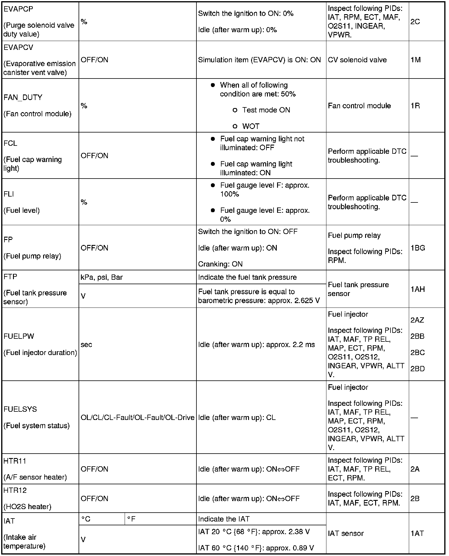 - PIDs for the following parts are not available on this model. Go to the appropriate part inspection.