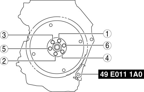 Tighten the new drive plate installation bolts uniformly in two or three steps in the order shown in the figure.