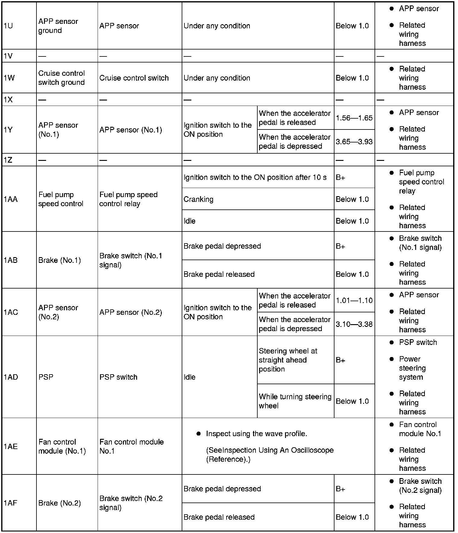 - For input/output signals except those of the monitoring items, use a voltmeter to measure the PCM terminal voltage.