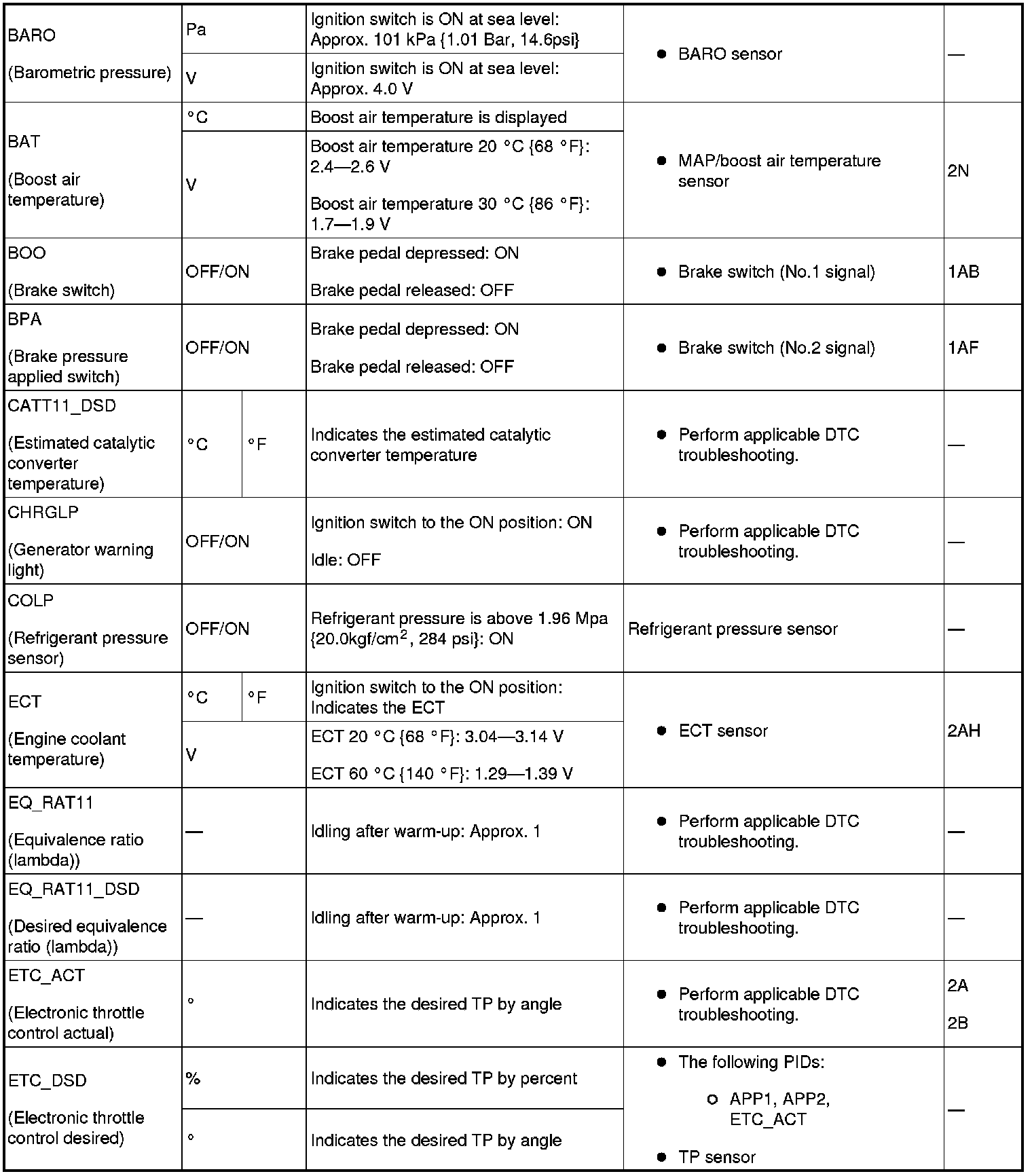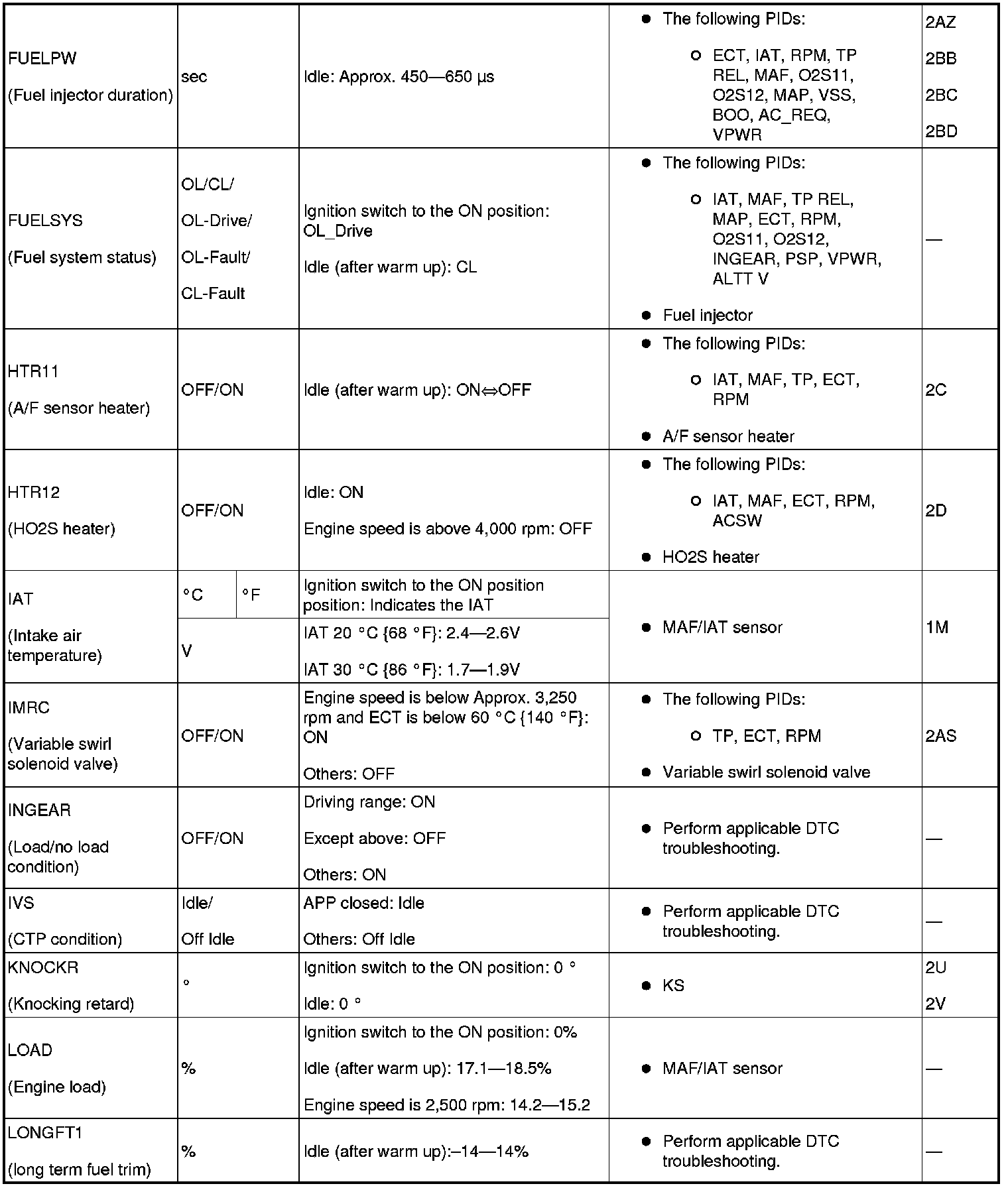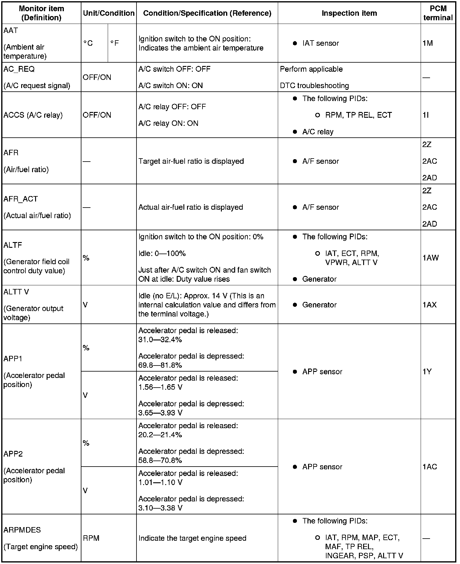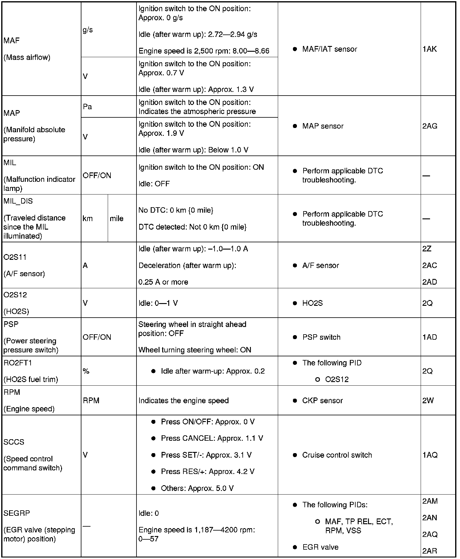 - If PID value is not within the specification, follow the instructions in the "Inspection item" column.
