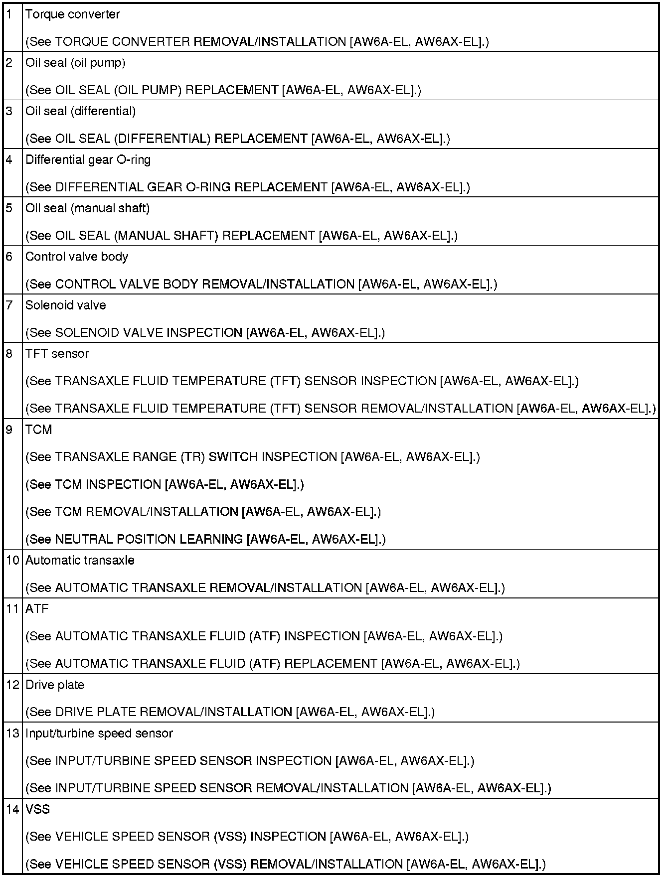 AUTOMATIC TRANSAXLE LOCATION INDEX [AW6A-EL, AW6AX-EL]