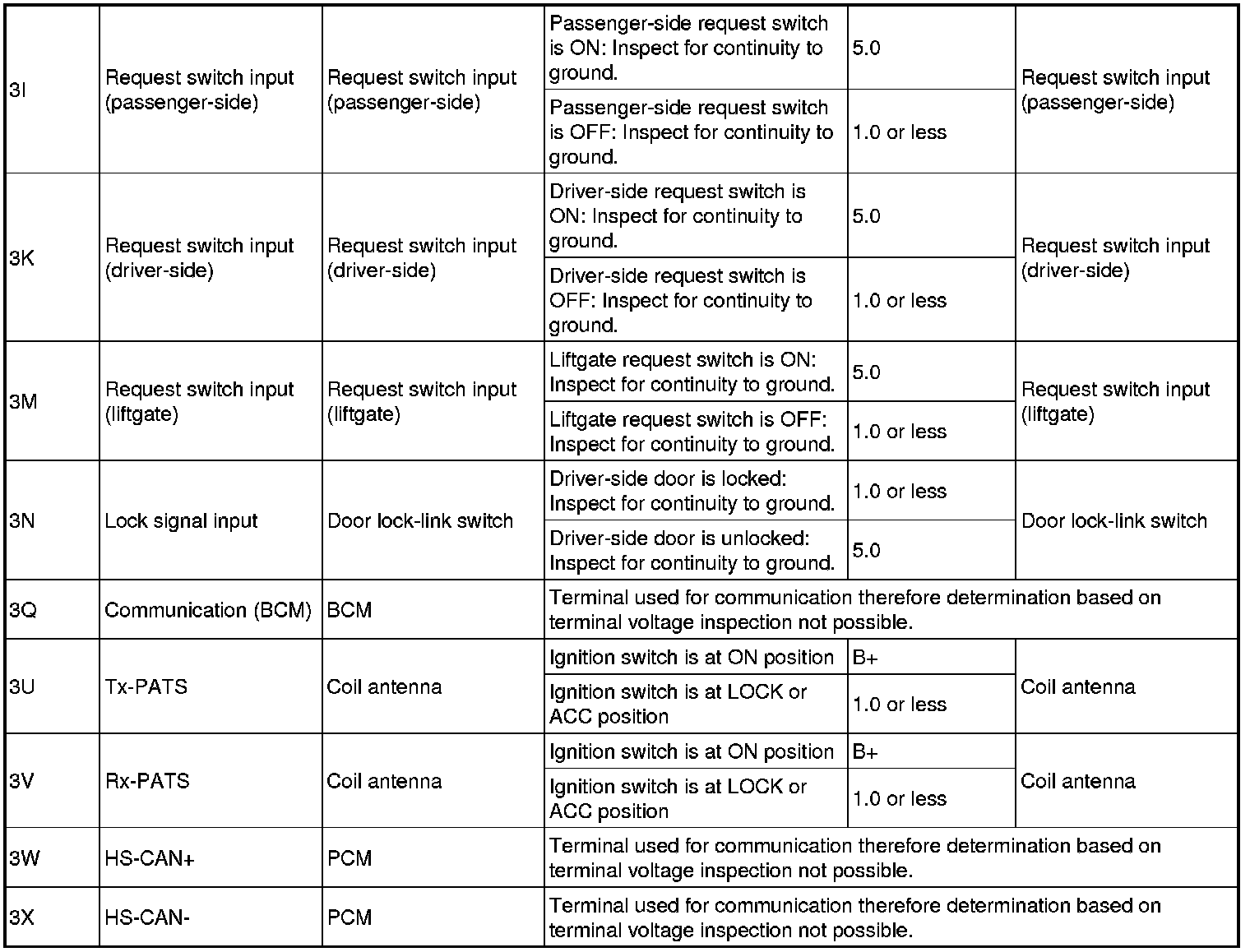 - If the voltage is not as specified in the Terminal Voltage Table (Reference), inspect the parts under "Inspection item(s)" and related wiring harnesses.