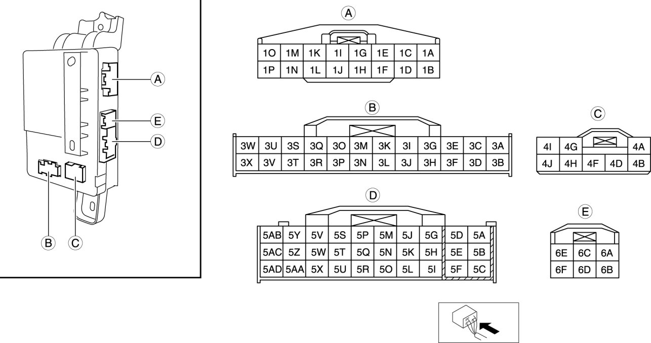 - Front door switch (driver-side) signal: 5AB (+) -> body ground (-)