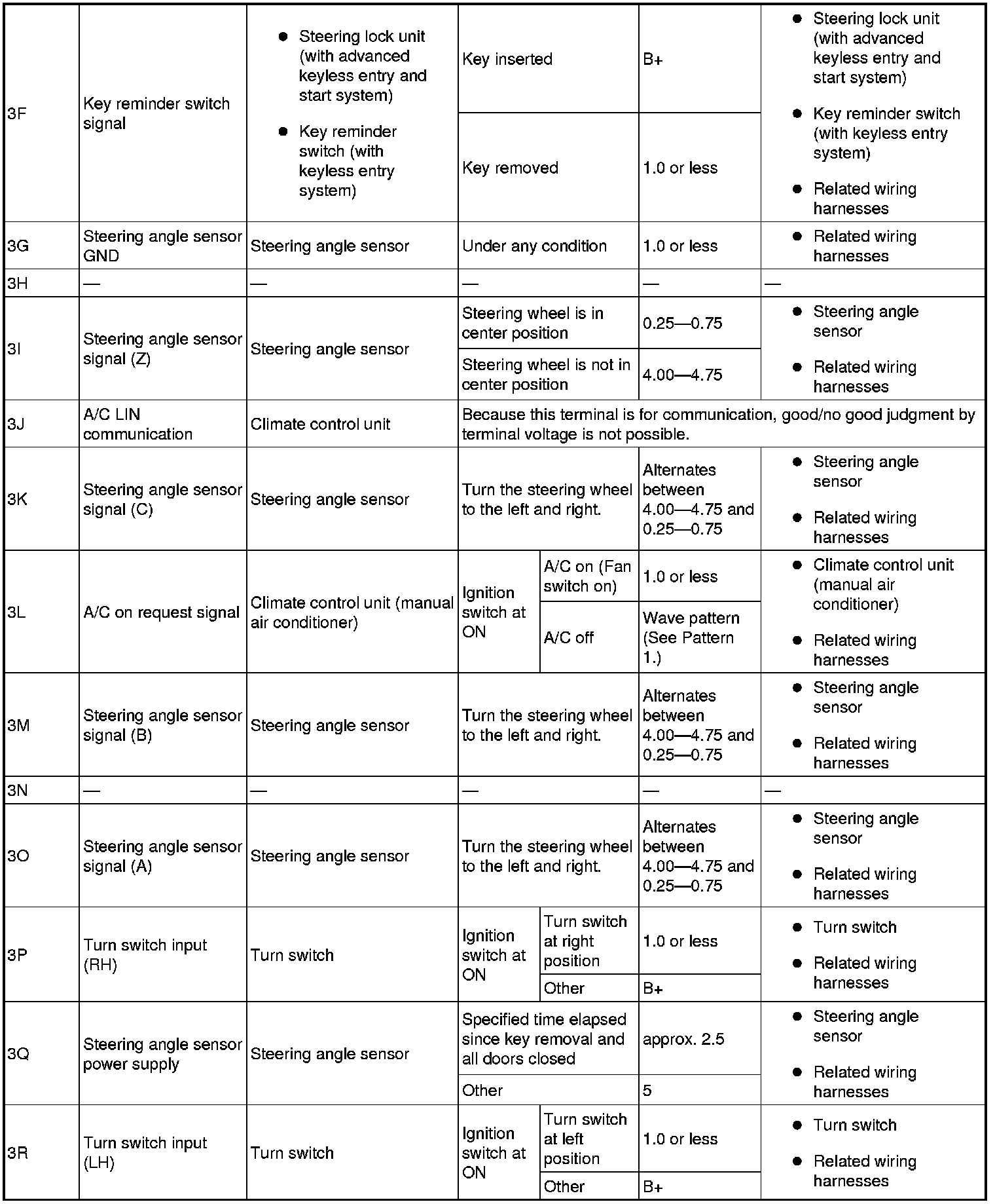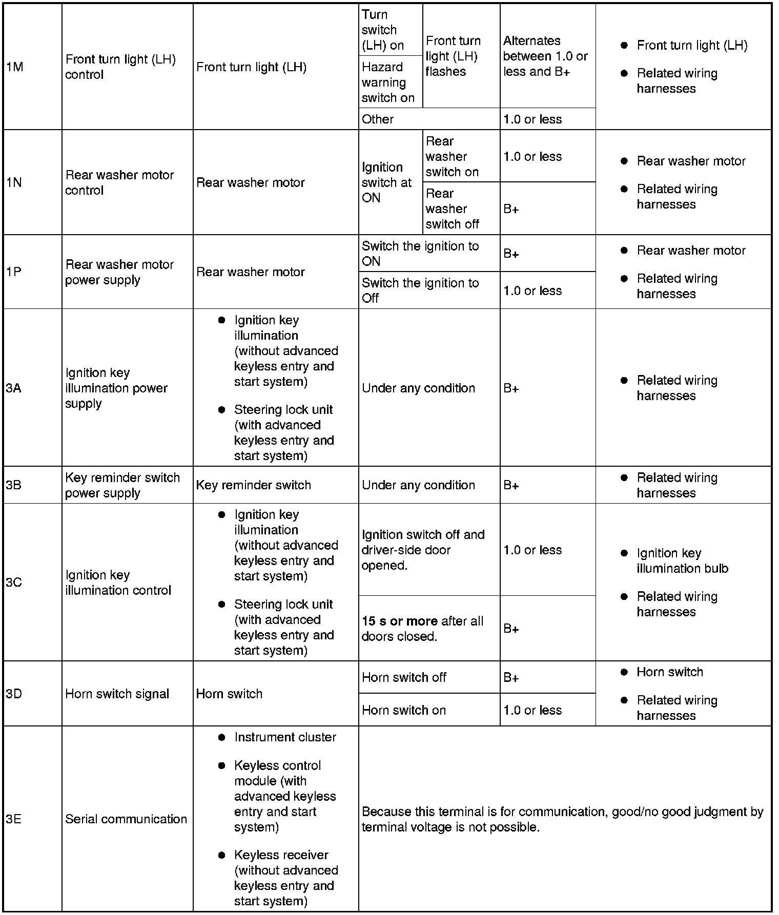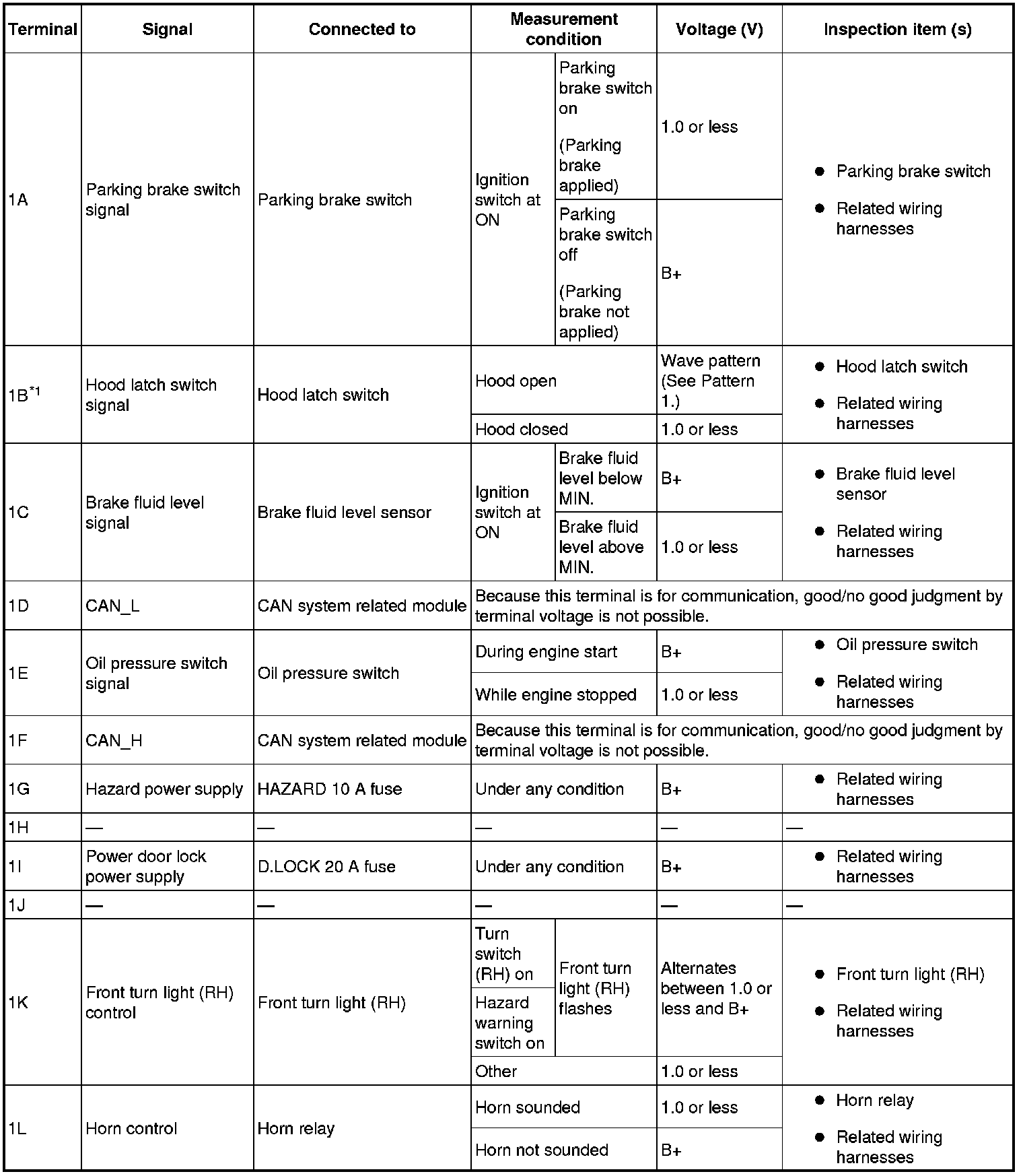 - If the voltage is not as specified in the Terminal Voltage Table, inspect the parts under "Inspection item (s)".