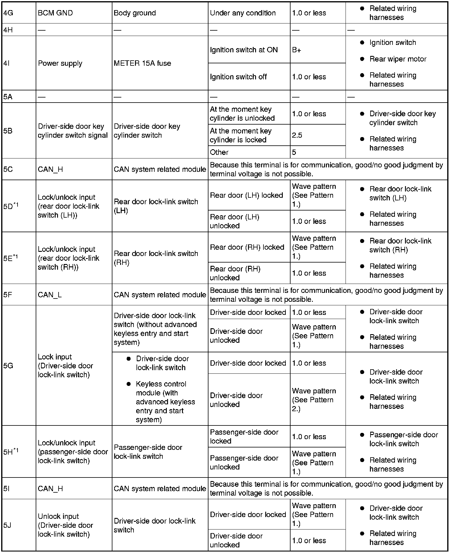 - Lock/unlock input (rear door lock-link switch (LH)): 5D (+) -> body ground (-)