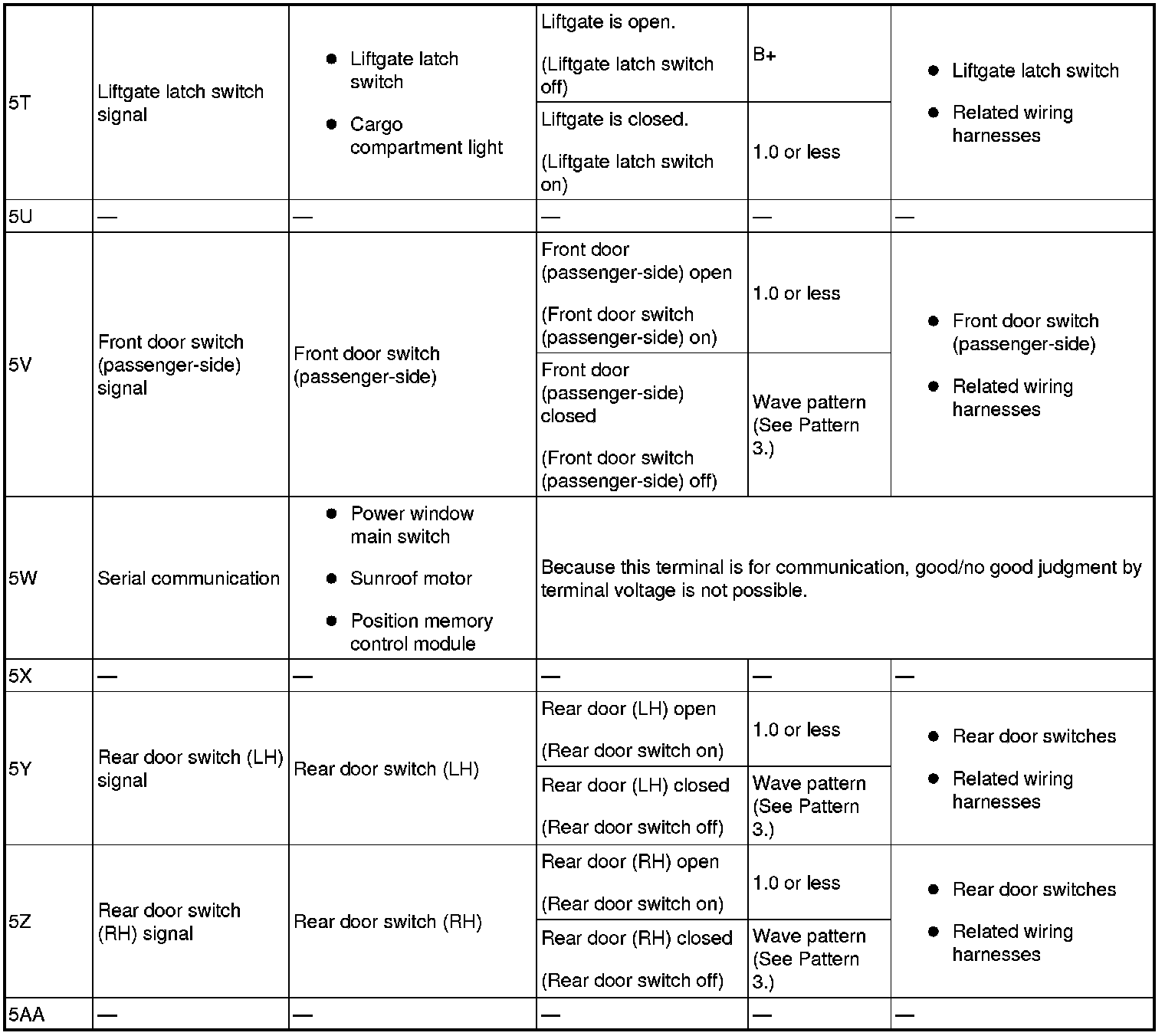 - Rear door switch (RH) signal: 5Z (+) -> body ground (-)