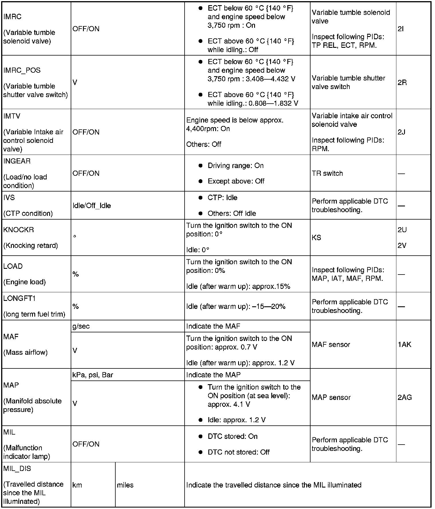 - ACCS, ALTF, ARPMDES, EVAPCP, EVAPCV, FAN_DUTY, FP, IMRC, IMTV, INJ_1~4, SEGRP, TEST, VT Duty1 wt